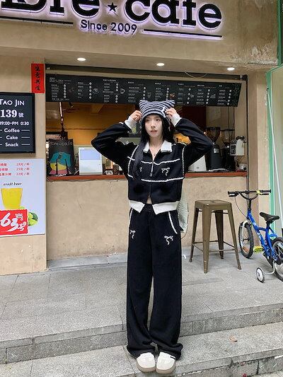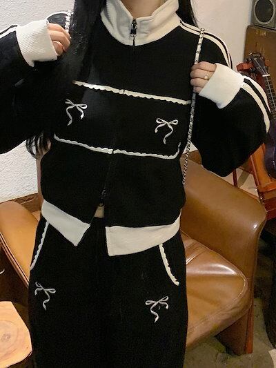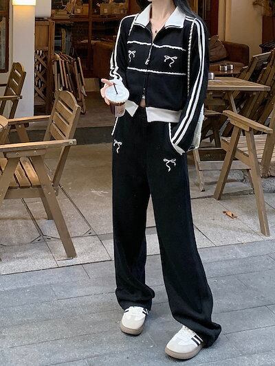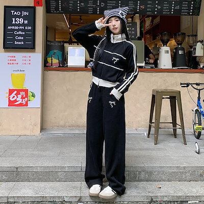 2024 秋 上下2点セット トップス お出かけ韓国 羽織り ショート丈フルラウンドヘムサイズ丈ボトムス ストレート系冬 ゆったりレディースシルエット スタイルアップワイドお出かけトラック