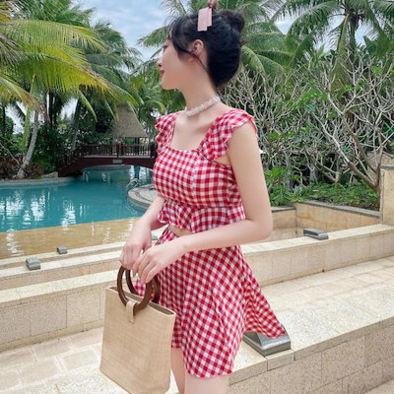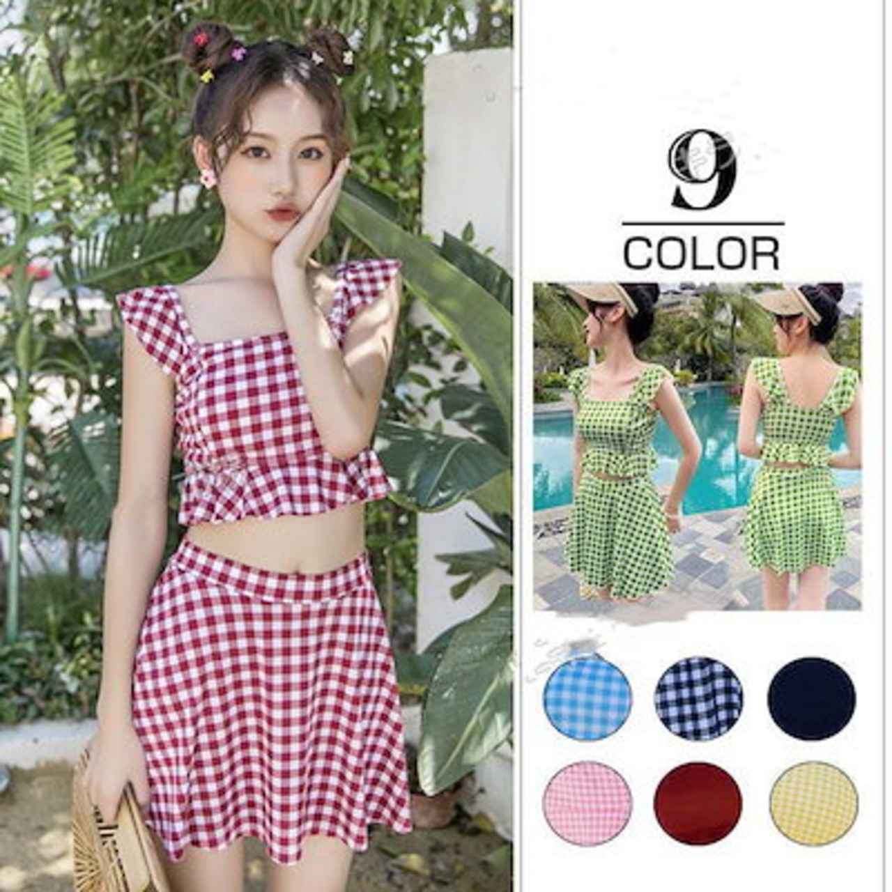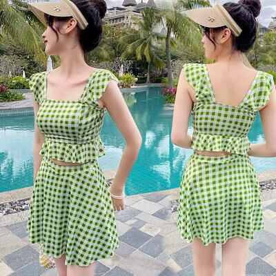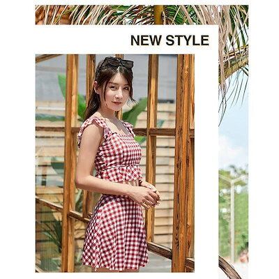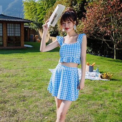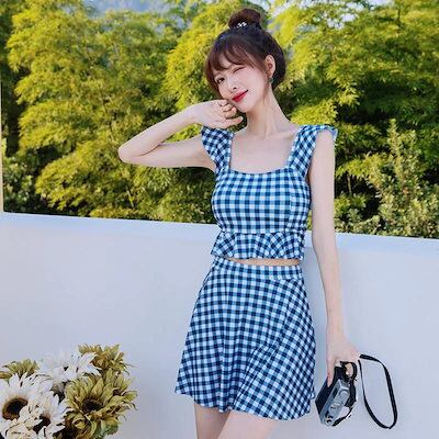 超人気 水着 レディース 体型カバー ビキニ ビスチェ風 ハイウエスト 2点セット ママ水着 かわいい人気 ギンガムチェック柄 フレア フリル 20代 30代 40代