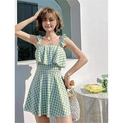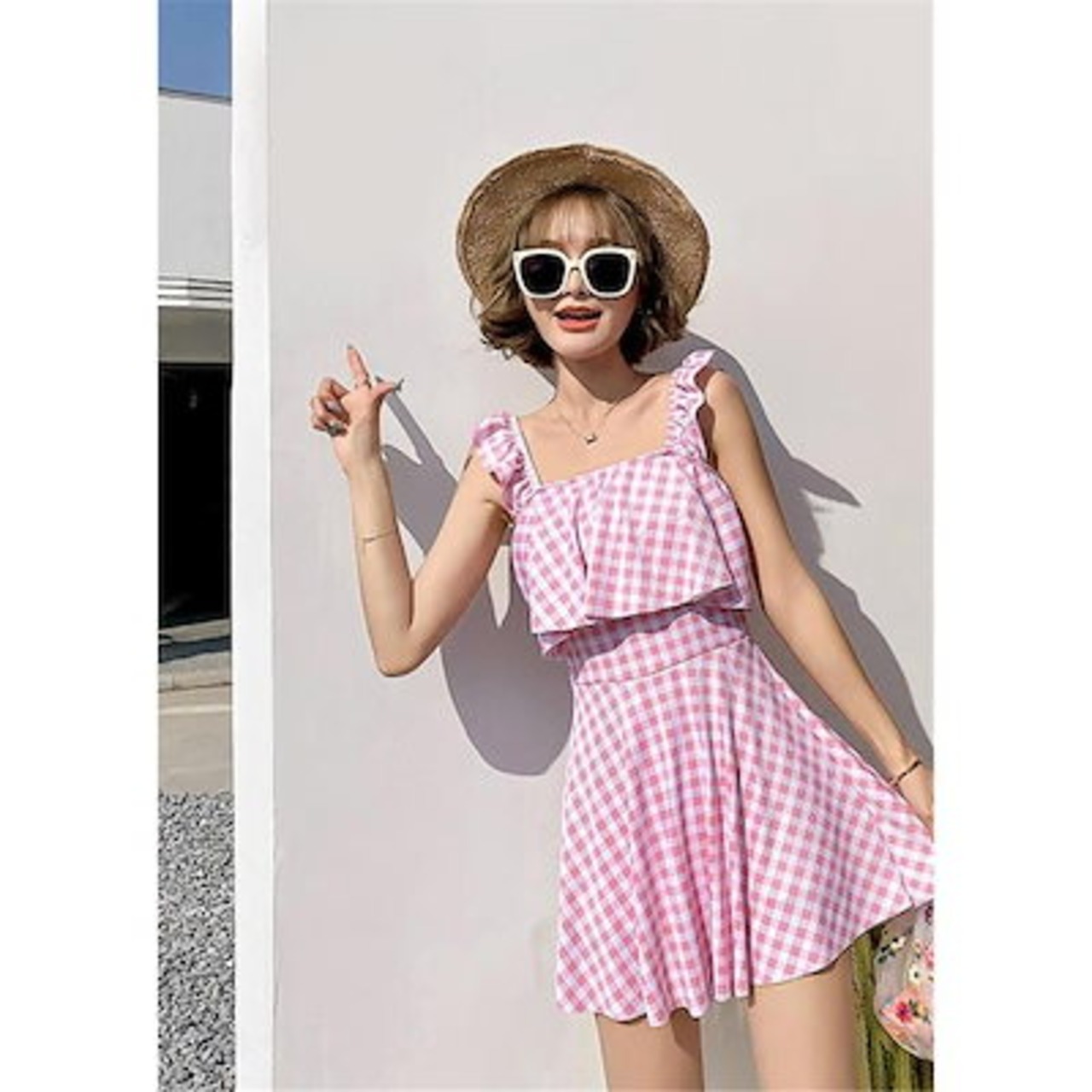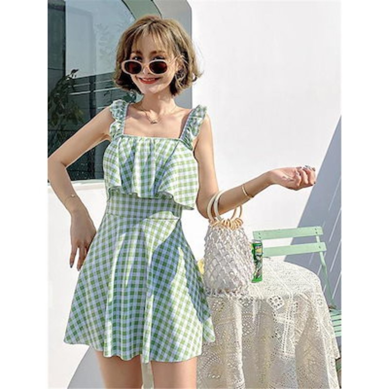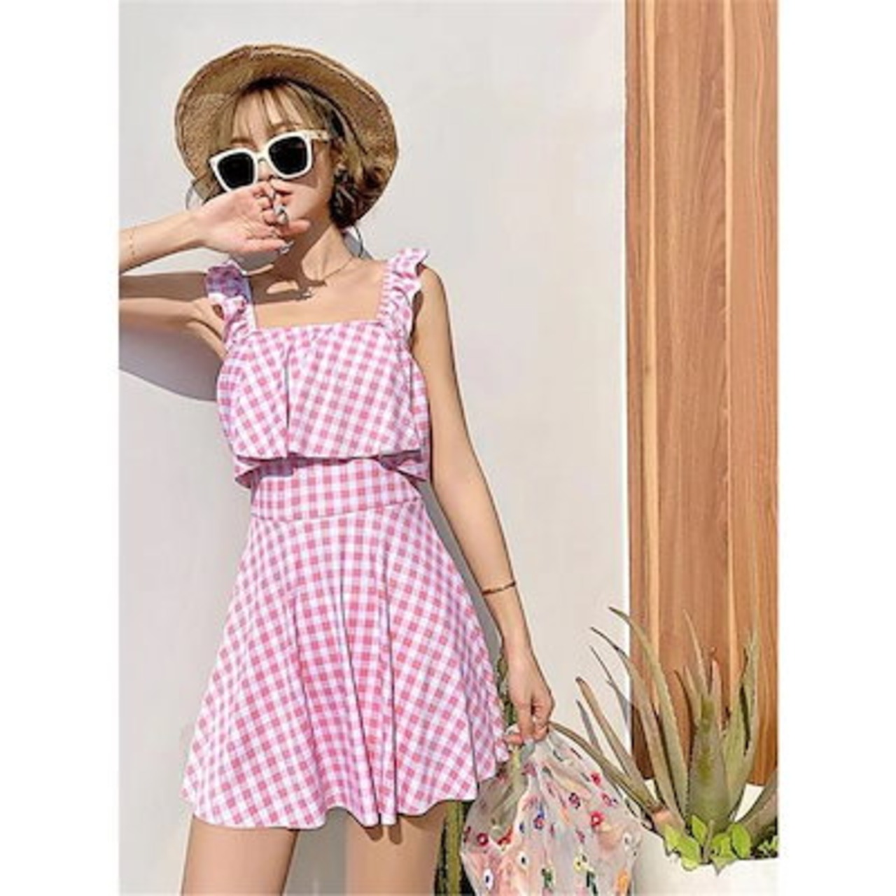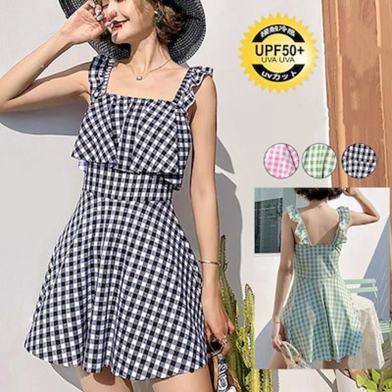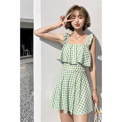 水着 レディース チェック柄 フレア フリル 体型カバー ビキニ ビスチェ風 ハイウエスト ママ水着 かわいい 女性用 可愛い