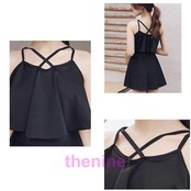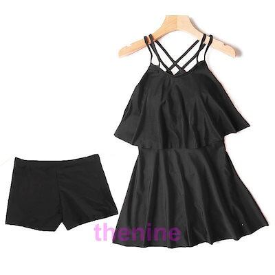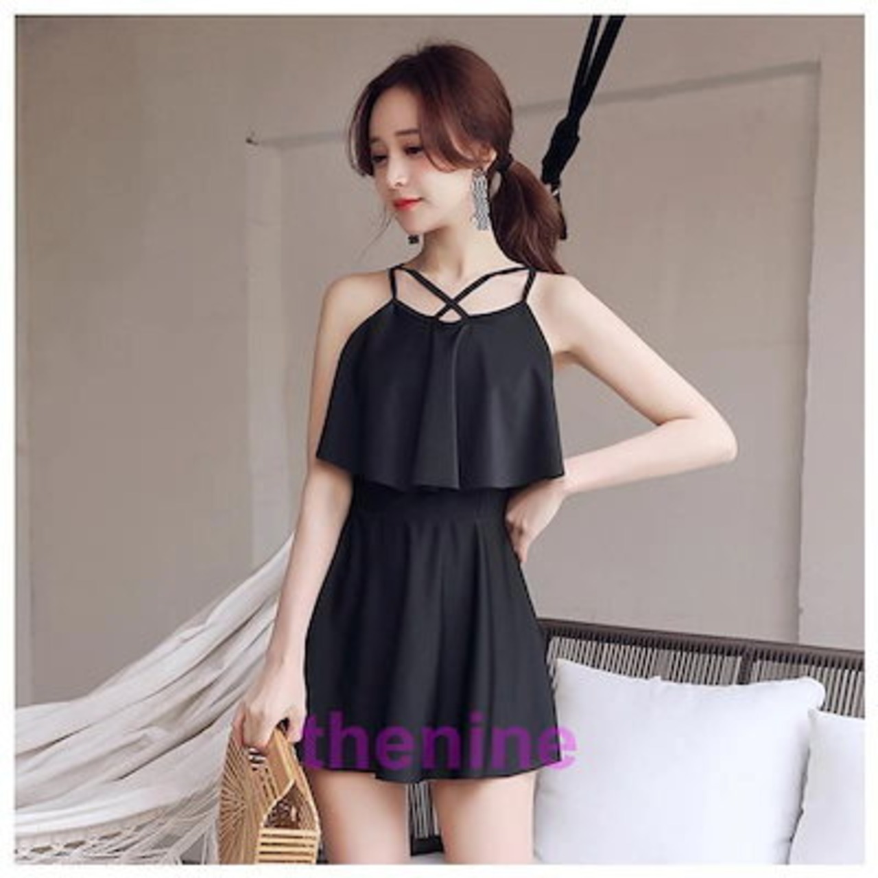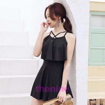 水着 ワンピースタイプ レディース 女性用 婦人用 スイムウェア 水泳用品 ミニ丈 袖なし クロスストラップ フレア 無地 単色 ブラック 黒 かわい
