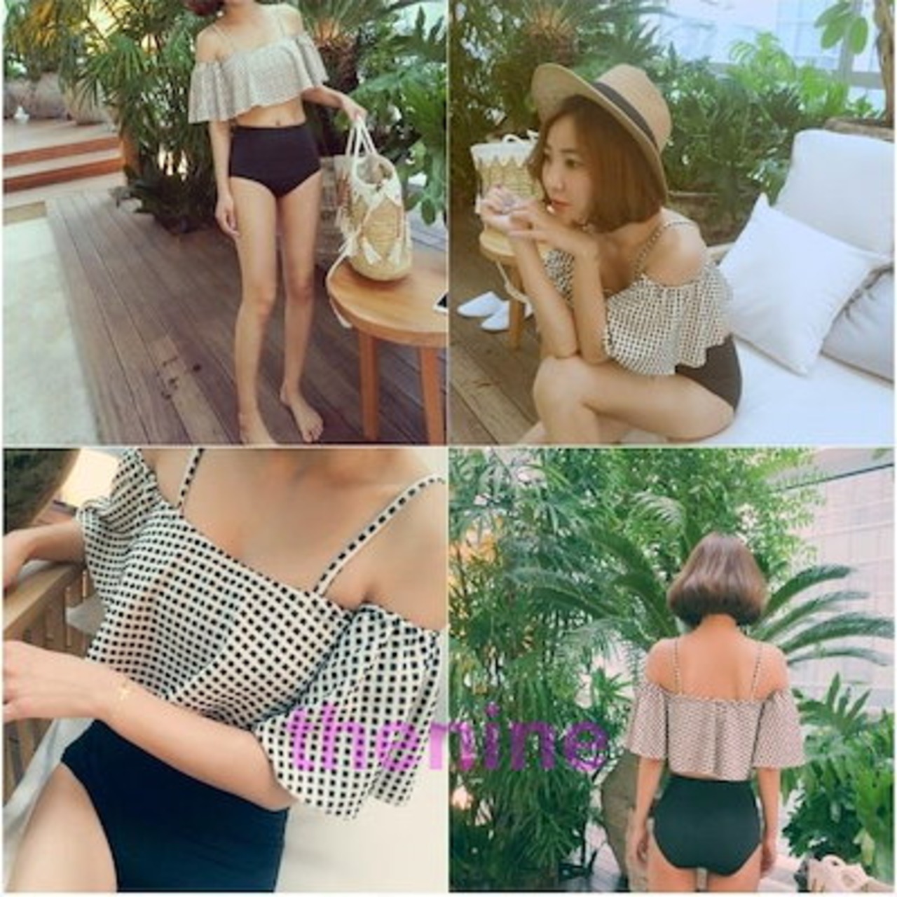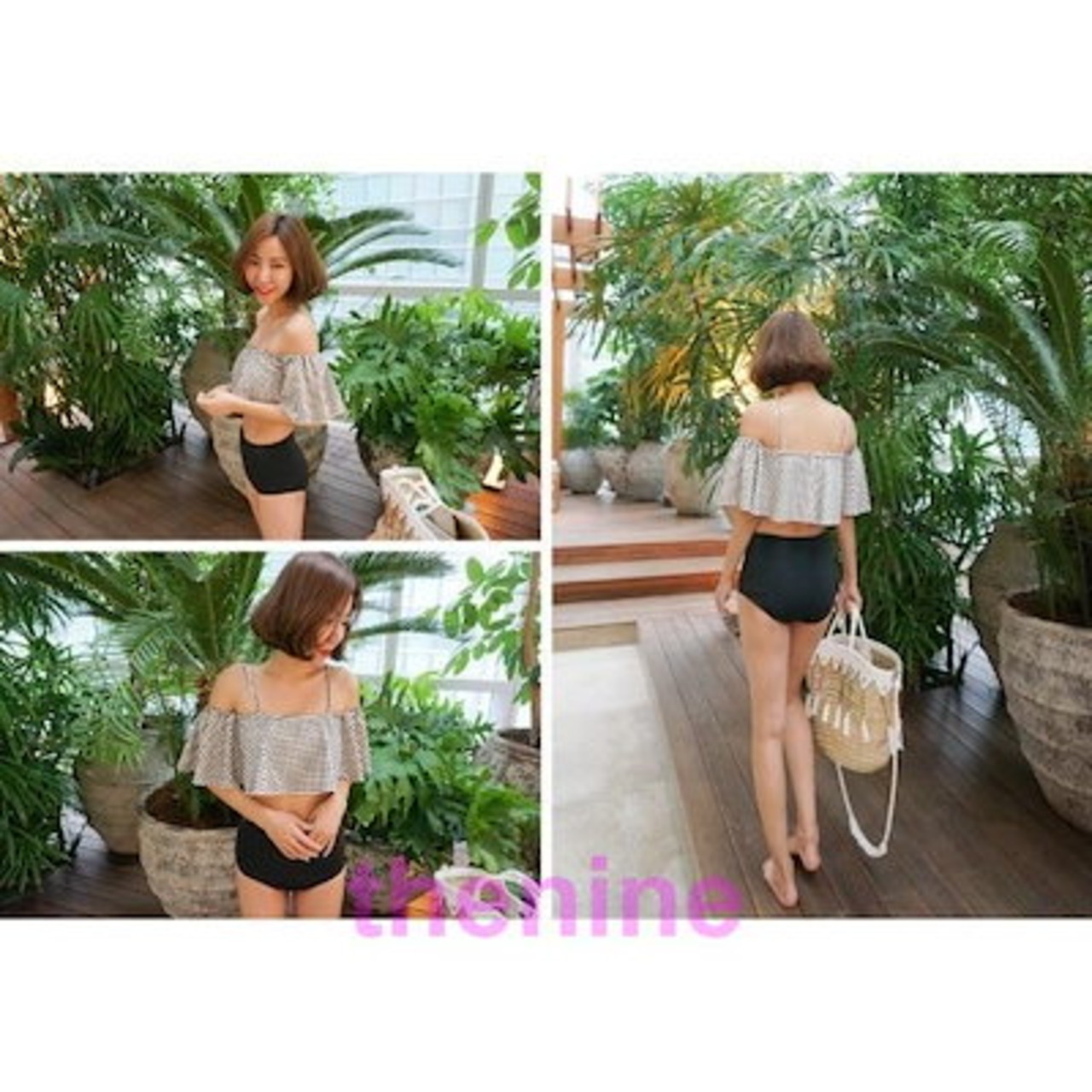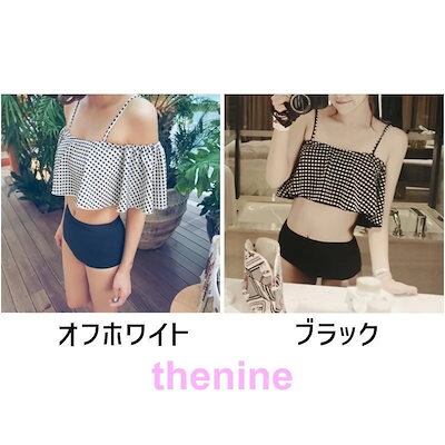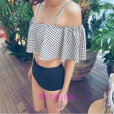 水着 ビキニ 上下セット オフショルダー レディース 女性 スイムウェア 2way フリル ドット柄 ハイウエスト かわいい おしゃれ 水泳 プール