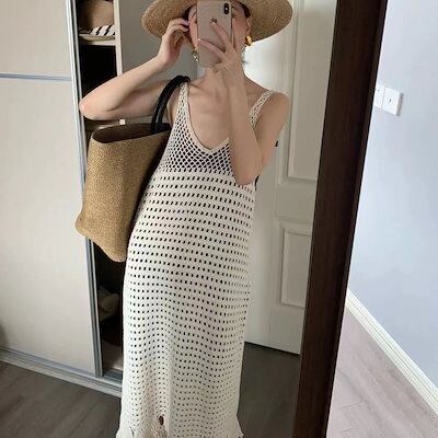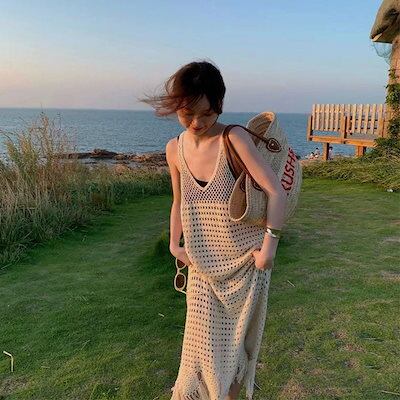 レトロ 透かし彫り ニット キャミソールワンピース 夏ワンピース レディース ロングワンピース 旅行 カップ 付きインナー