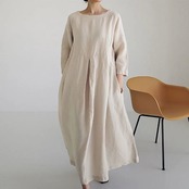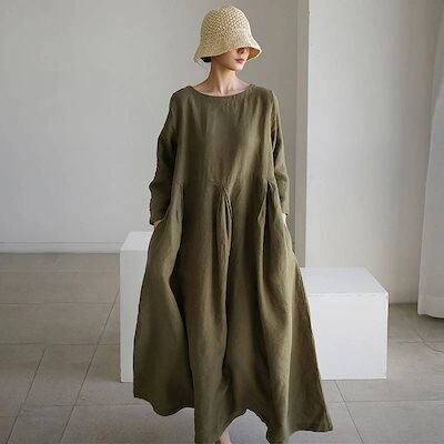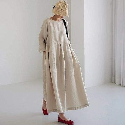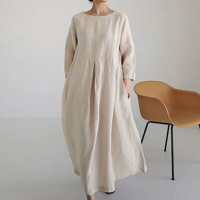ゆったり 綿麻 ワンピース レディース ラウンドネック ロングワンピース 気質 キャンパス風 ワンピース カップ 付きインナー
