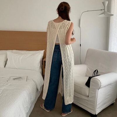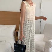 韓国ファッション 夏 新作 シンプル カジュアル バックレス ノースリーブ 透かし彫り ニット ロングワンピース レディース カップ 付きインナー