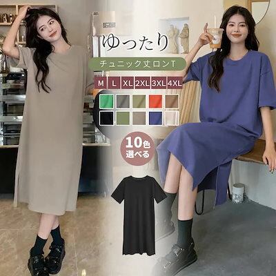 2点ご購入で2OO円OFF 24H限定!涼しい 半袖 レディース Tシャツワンピース ロング ひざ下 ラウンドネック クルーネック プルオーバー 大きいサイズあり 無地 単色 ゆったり 体型カバ プリ