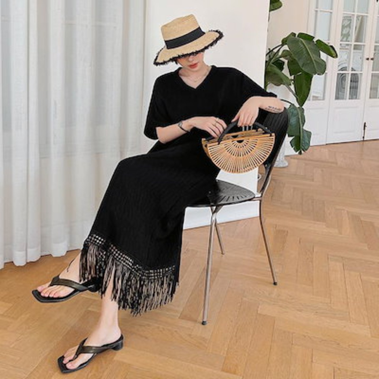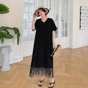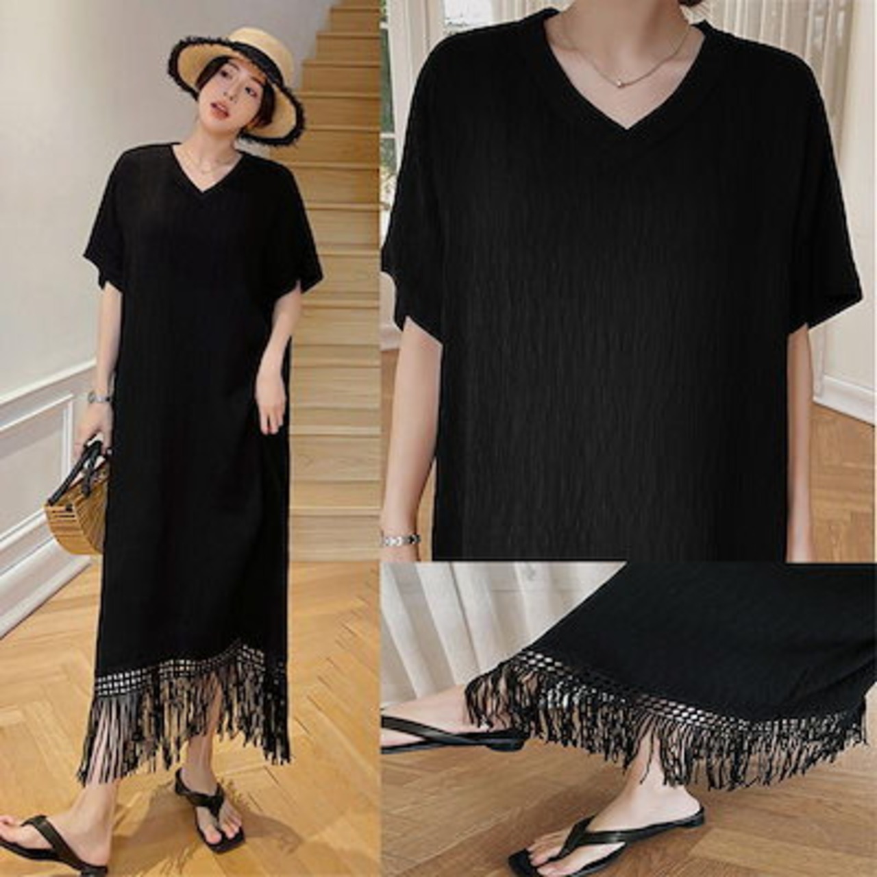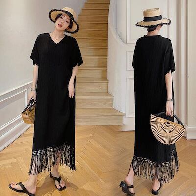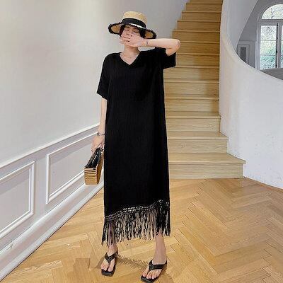 大きめ ワンピース ロングワンピース フリンジ Vネック カジュアル 百掛け 半袖ワンピース レディース カップ 付きインナー