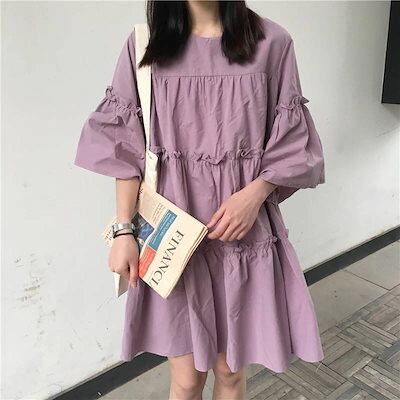 2024/カップ 付きインナー/春/夏/新作/韓国版/ゆったり/ワンピース/レディース/学生/ミドル丈/ドールドレス/Aラインドレス/半袖ドレス/レディースドレス/かわいいドレス