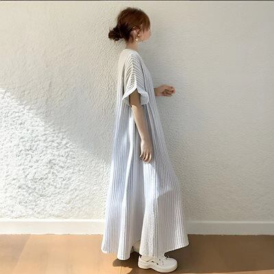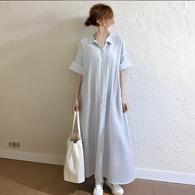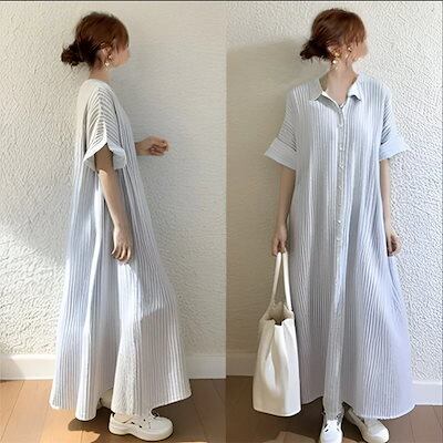 2024/夏/新作/雰囲気/ストライプ/プレスプリーツ/シャツ/カジュアル/シャツワンピース ワンピース カップ 付きインナー