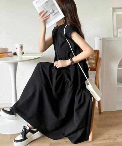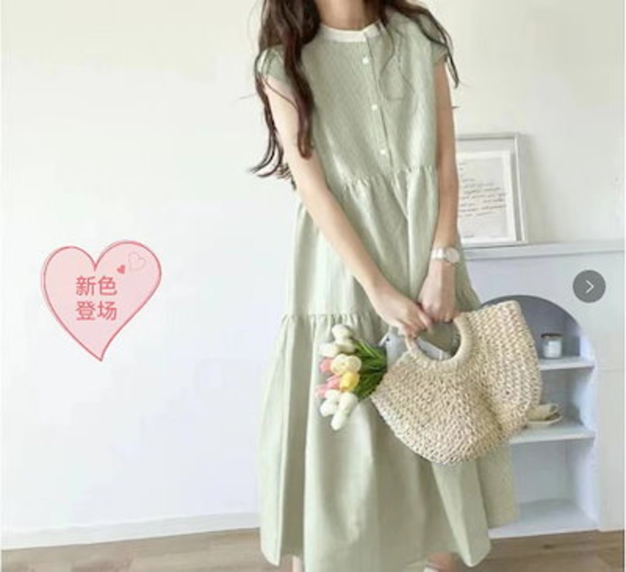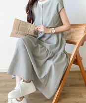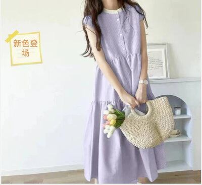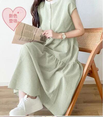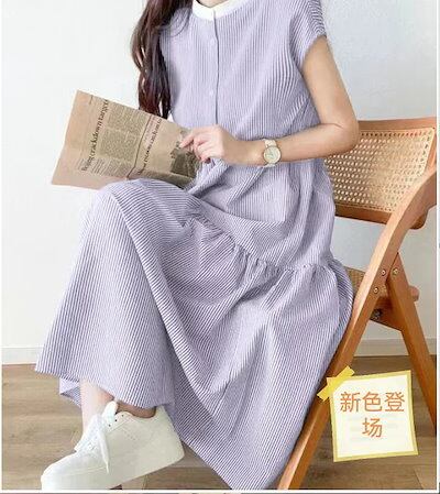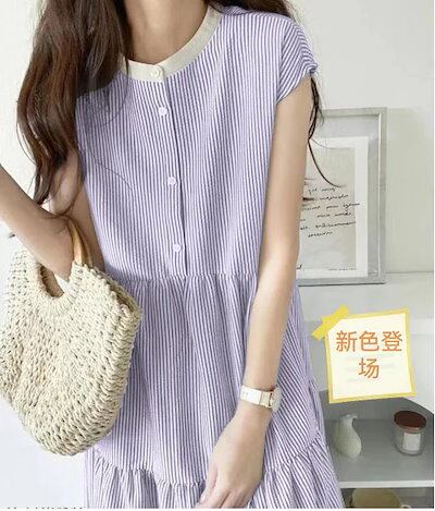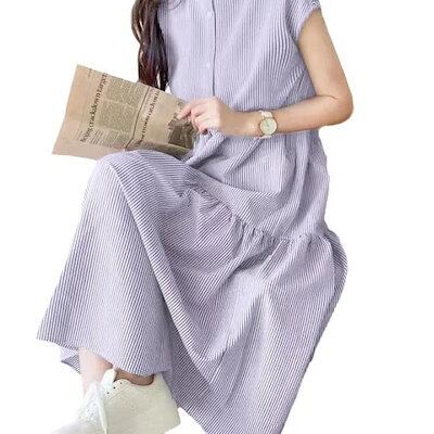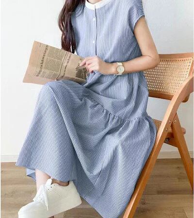 夏/ラウンドネック/三つボタン/ストライプ/ノースリーブワンピース/ロング/半袖/スタンドカラー/ワンピース/レディース カップ 付きインナー