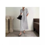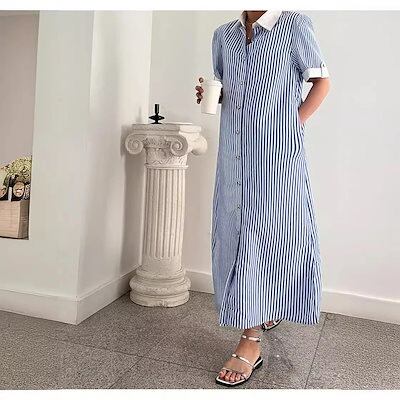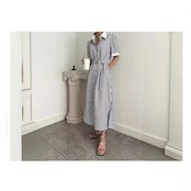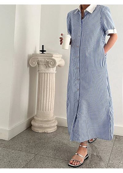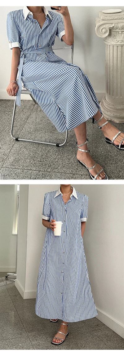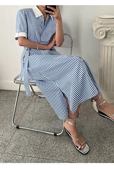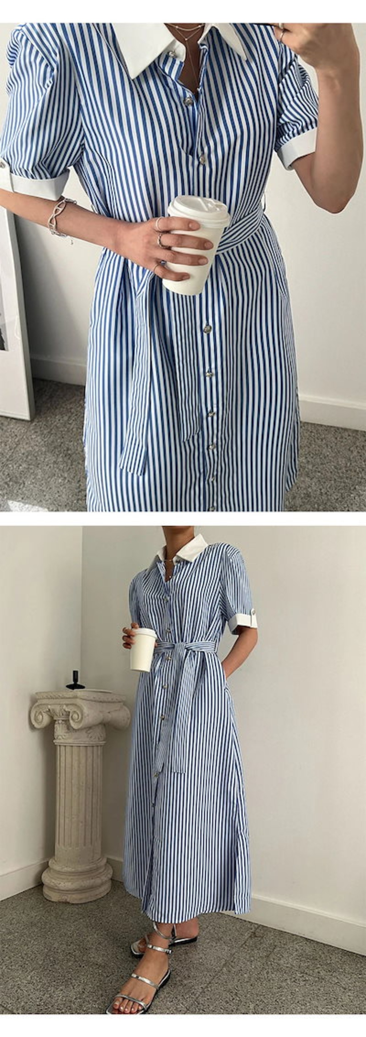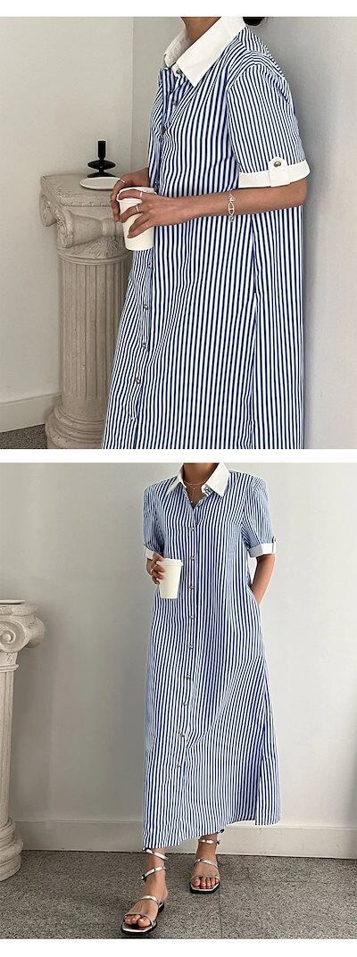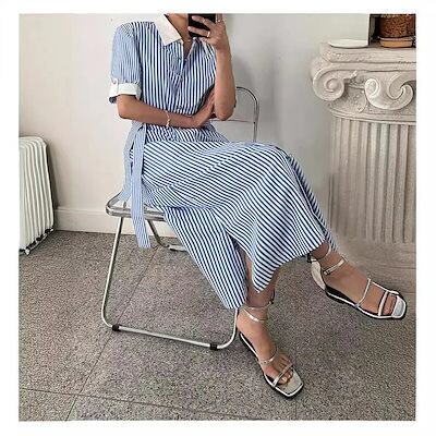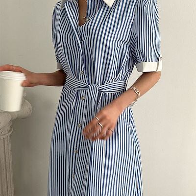 クラッシュオブカラー/ターンカラー/タイウエスト/薄手/シャツ/ワンピース/夏/半袖/ストライプワンピース/ワンピース カップ 付きインナー