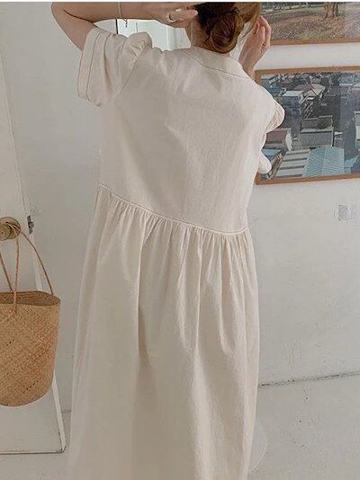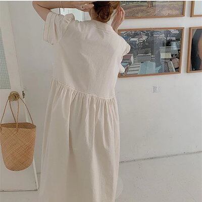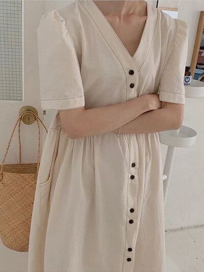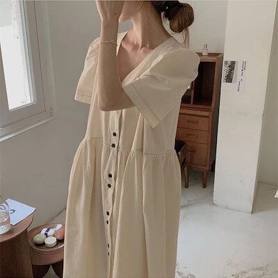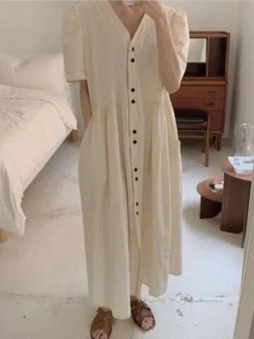 ゆったり/半袖/ワンピース/2024/春夏/Vネック/シングルブレスト/ロング/バブルスリーブ/ドレス カップ 付きインナー