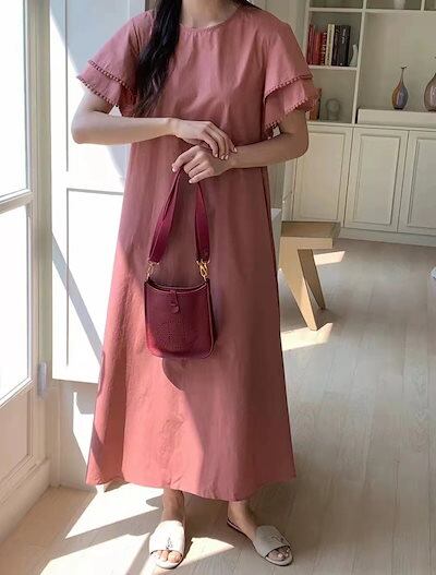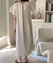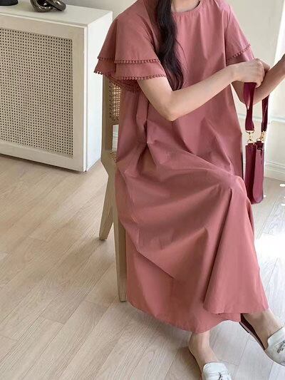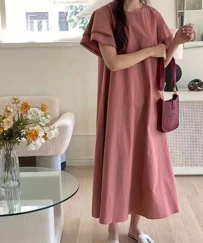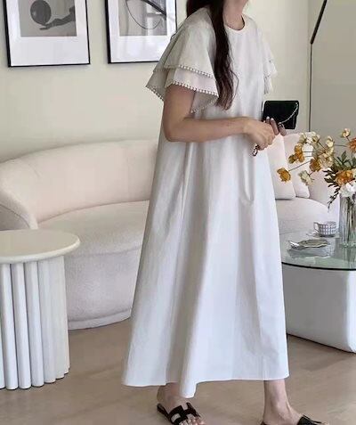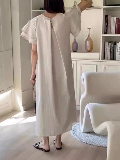 2024/ロング/ヴィンテージ/カジュアル/ラウンドネック/ダブルフリルスリーブ/バックボタン/ゆったり/薄手/夏/ドレス カップ 付きインナー