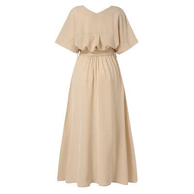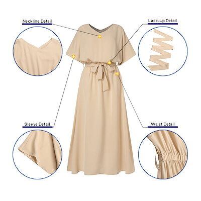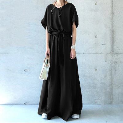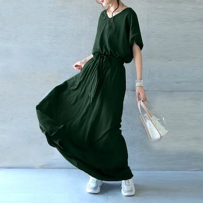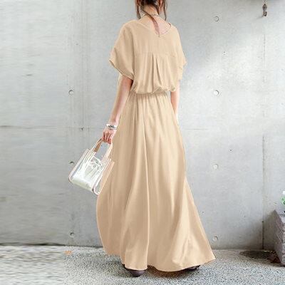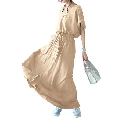 新作/Vネック/ウエストバンド/タイ/半袖/スウィングワンピース/ゆったり/大きいサイズ/超ロング床丈ワンピース/ロングスカート カップ 付きインナー