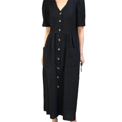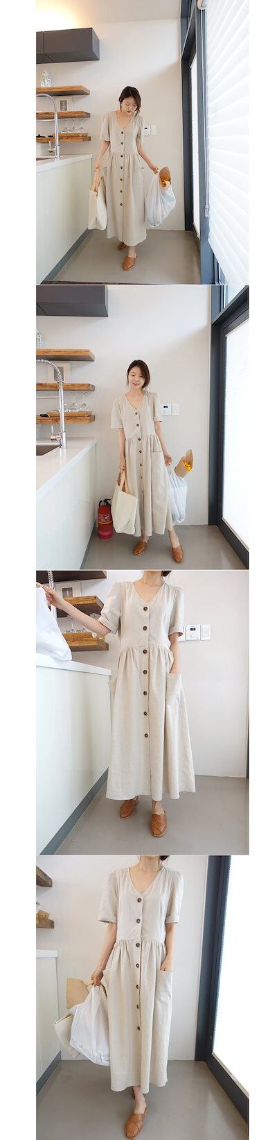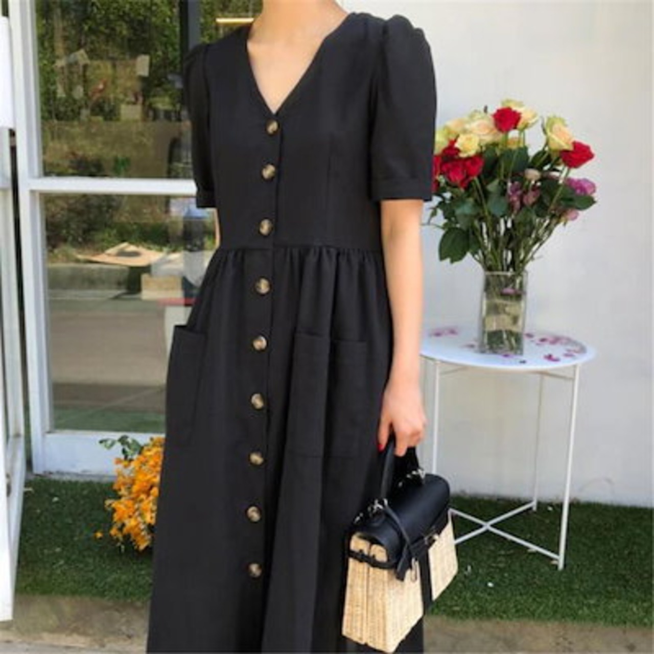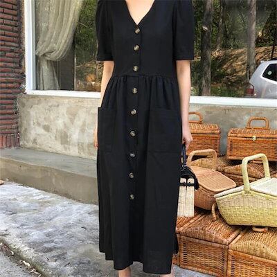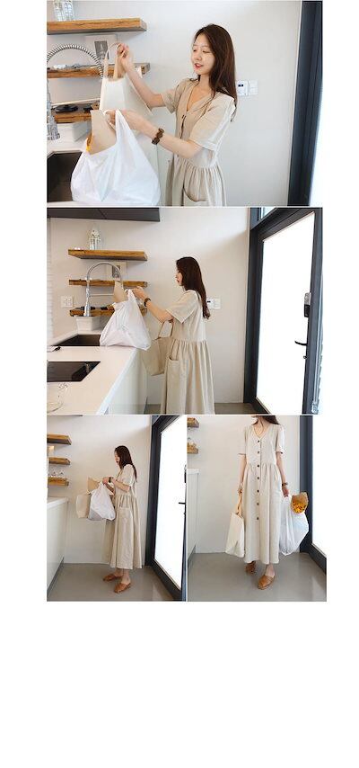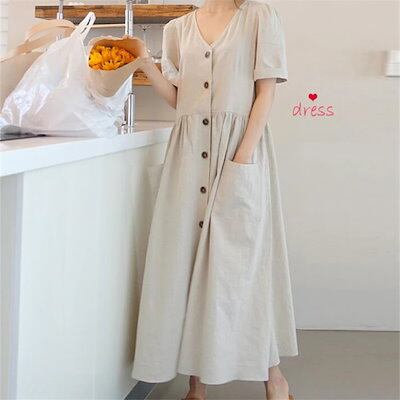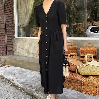 新作/シングルブレスト/ワンピース/2024/夏/ゆったり/半袖/Vネック/ロング/シャツドレス カップ 付きインナー