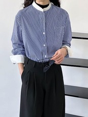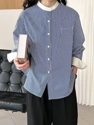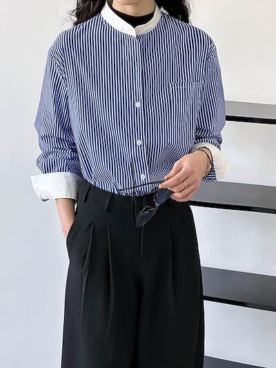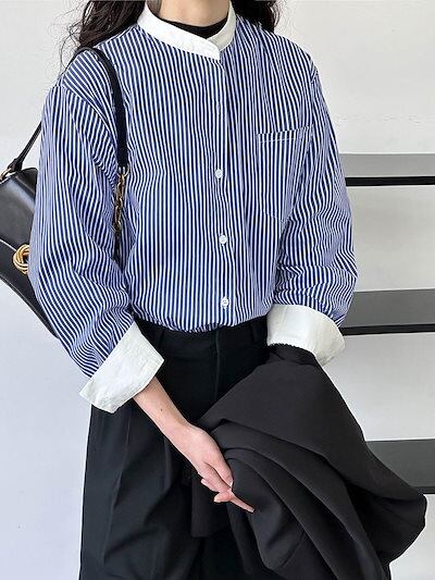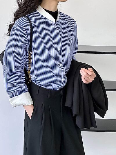 2024春カジュアルゆったりブルーストライプシャツ 韓国 ブラウス レディース 今っぽシアーシャツ 長袖 ファッション オフィス シャツ