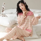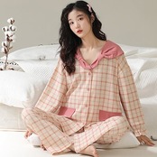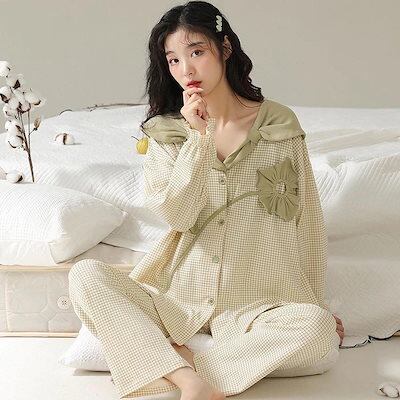 2023人気新作ルームウェアセットアップ折襟長袖トップスロングパンツ上下二点春夏服レディース部屋着韓国ファッションチェックプリント肌にやさしい色褪せない