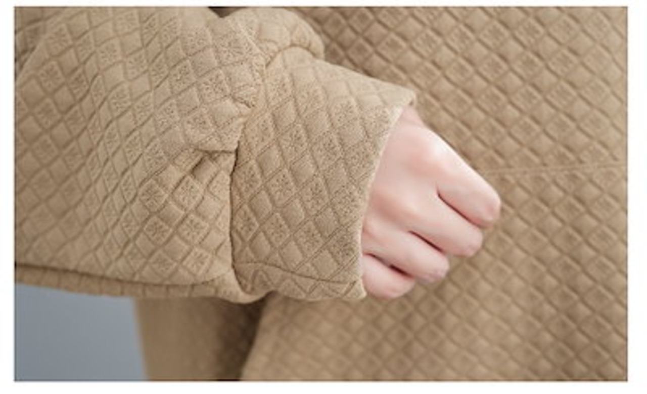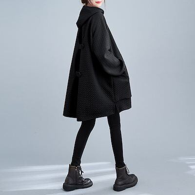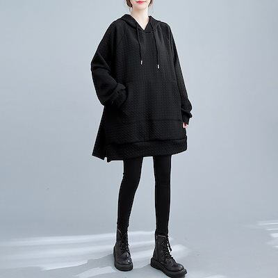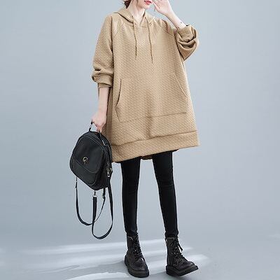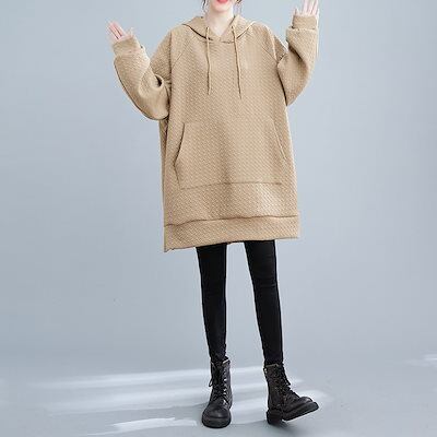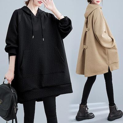 可愛い大きなポケット無地長袖トップス大きいサイズレディース秋服韓国ファッションパーカー中長着痩せ効果