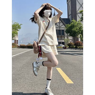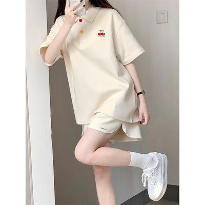 コットンポロシャツファッションスポーツウェアスーツレディースサマーカレッジスタイルカジュアルルーズ半袖ショートパンツ2点セット