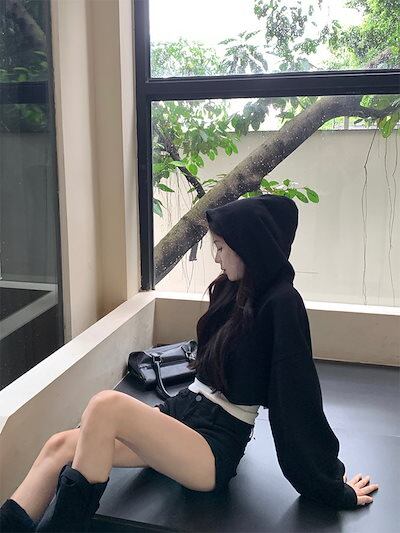 2024 秋冬トップス フード付き スウェット 長袖 丈短め 秋 黒 ブラック おしゃれ かわいい 韓国ファッション レディース お出かけ