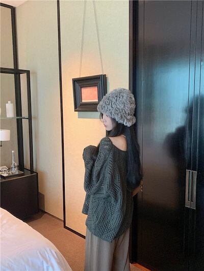 2024秋冬トップス ニット 透かし彫り 長袖 オフショルダー ゆったり 細見え 秋 茶色 おしゃれ かわいい ガーリー キュート 韓国ファッション レディース お出かけ
