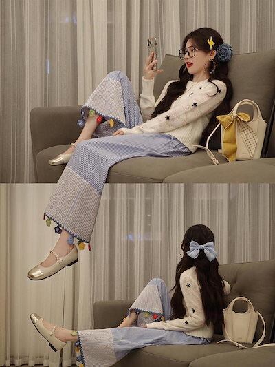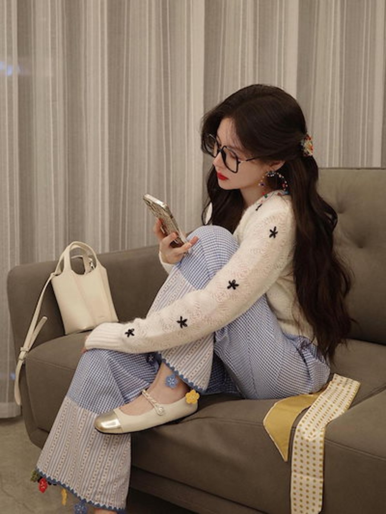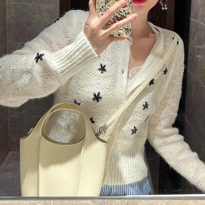 2024 秋冬トップス カーディガン ニット Vネック ボタン 長袖 花柄 細見え 秋 白 おしゃれ かわいい ガーリー キュート 韓国ファッション レディース お出かけ