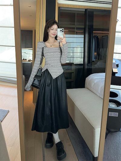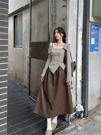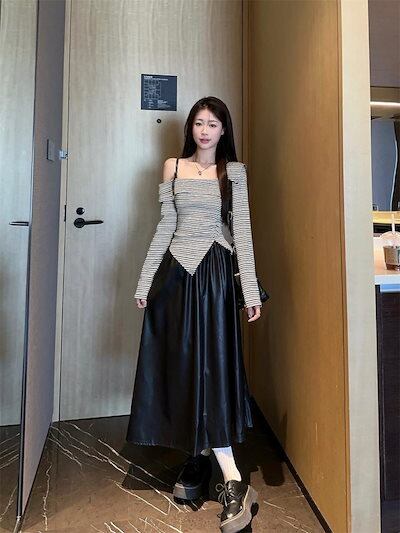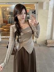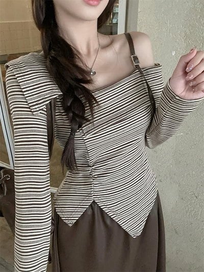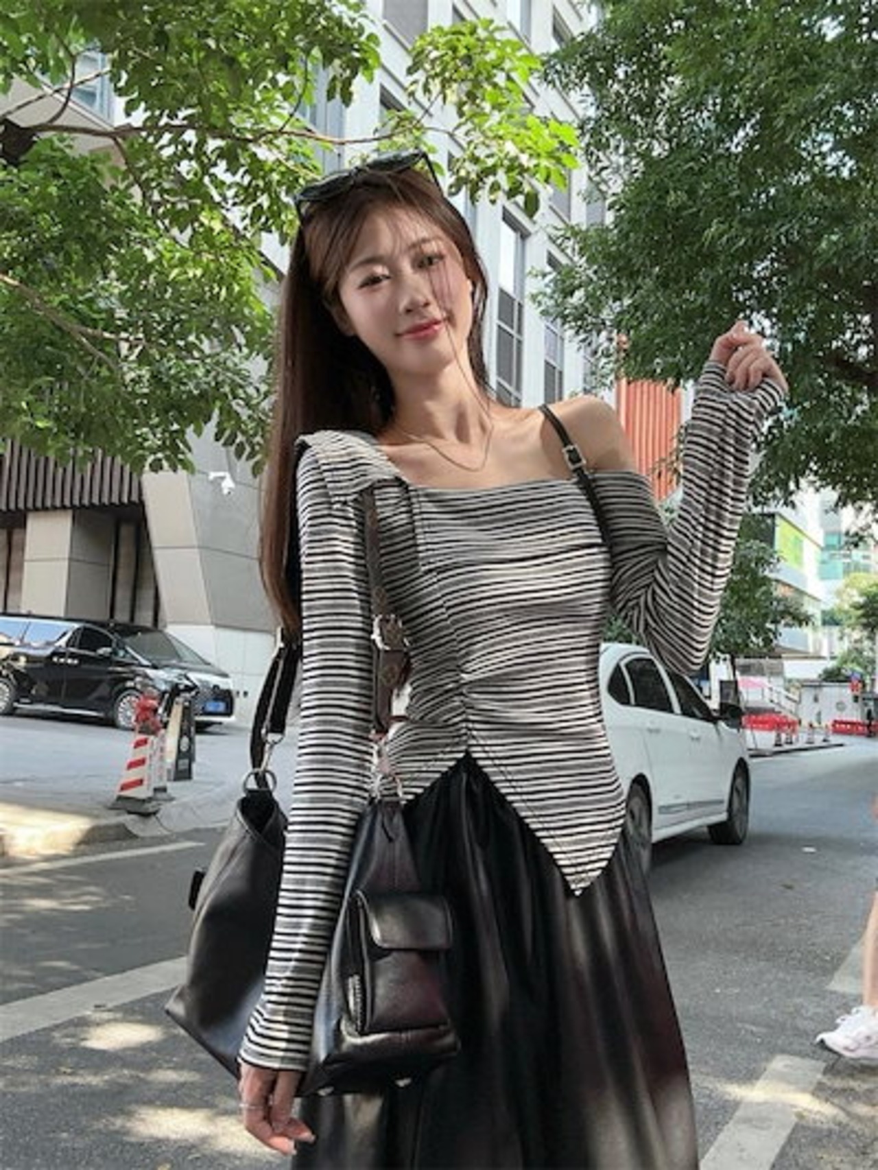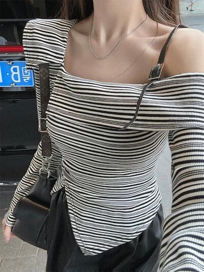 2024秋冬トップス シャツ 長袖 ボーダー アシンメトリー 肩見せ 大人っぽい ガーリー 甘め キュート 秋 黒 茶色 おしゃれ かわいい 韓国ファッション レディース お出かけ