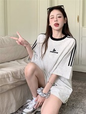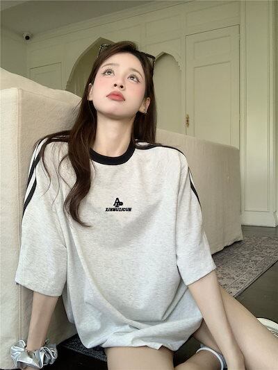 2024夏 韓国可愛い風トップス Tシャツ ロング丈 ファッション 半袖スリムフィット サイド ペイントシルエット ゆったり 休日レディースサイズ韓国系ネック_おしゃれ カジュアル メンズライク T