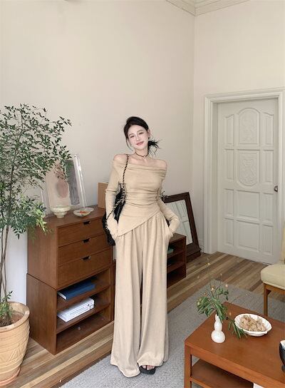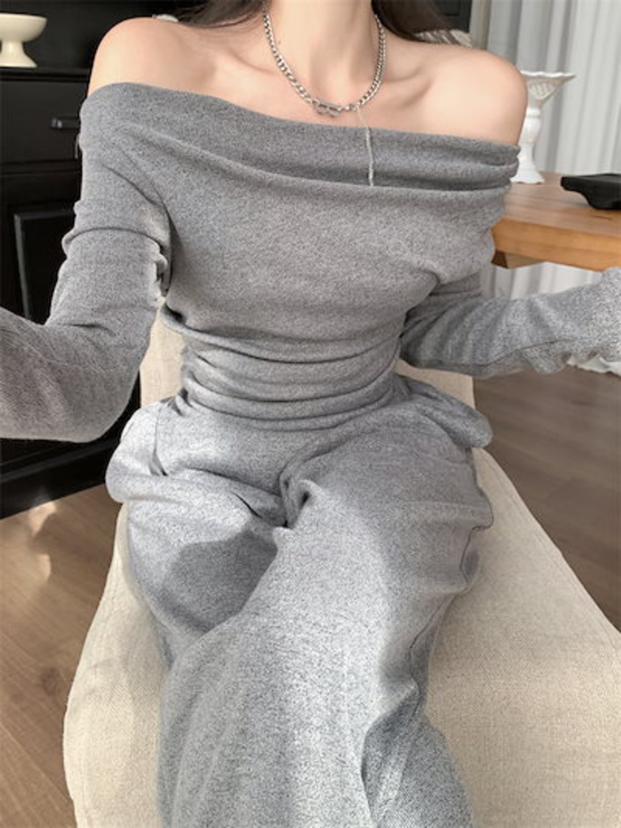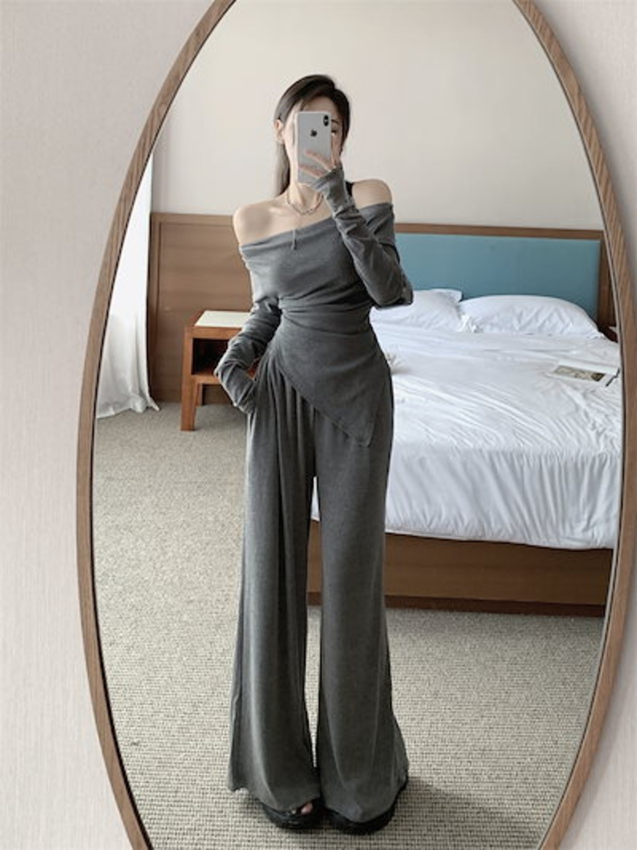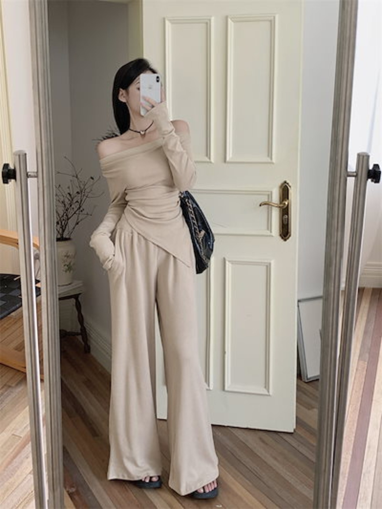 2024 秋冬 トップス 長袖 かわいいラウンドネック トレーナーTシャツ 肌見せ レディース ストレート韓国風ルーズゆったりカジュアルおしゃれサイズシルエットファッション系コーデ衣装上下セットアップ