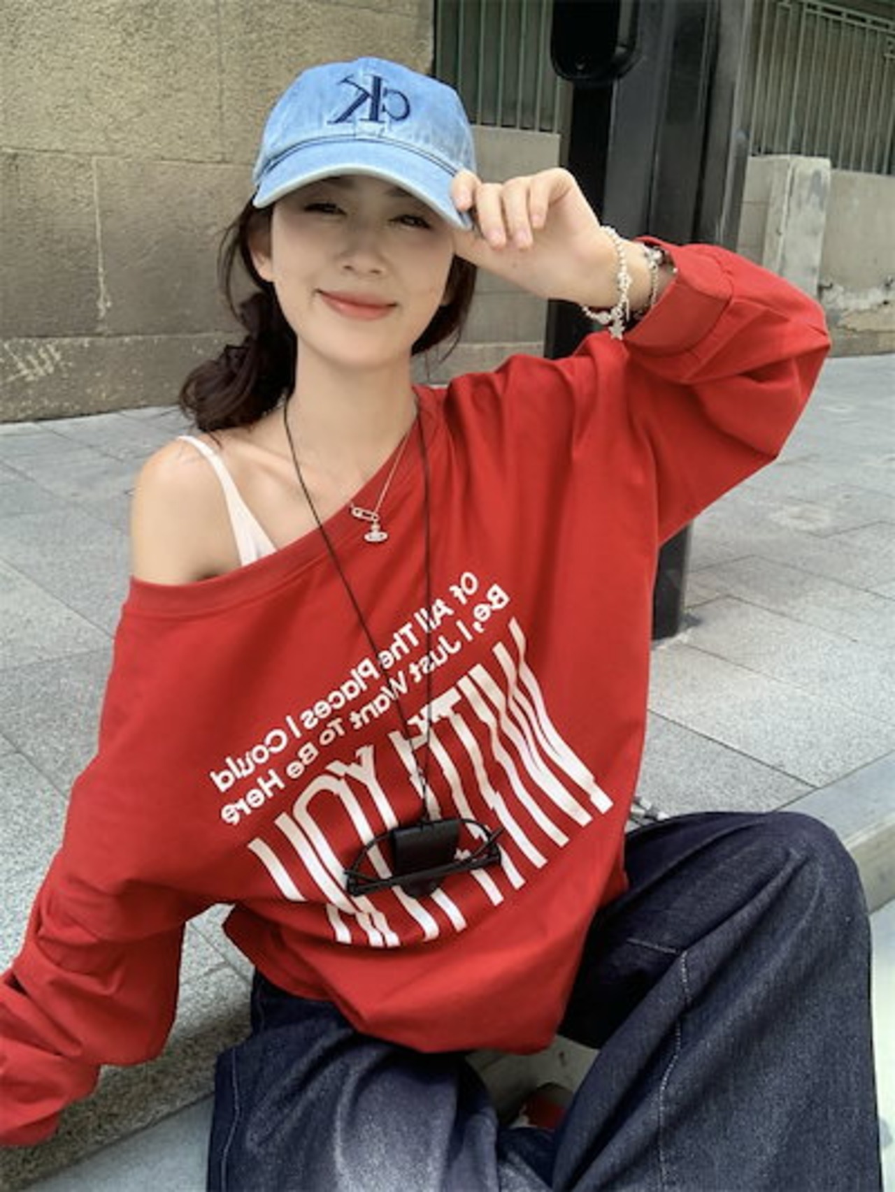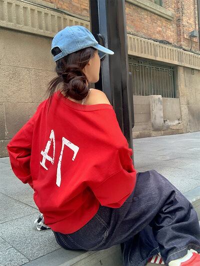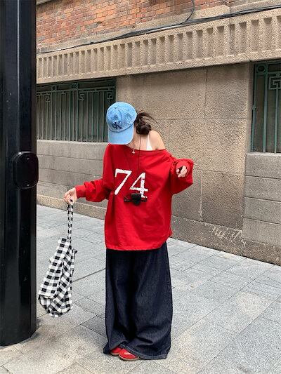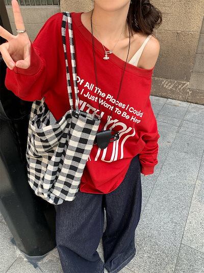 2024 秋冬 トップス 長袖 かわいいラウンドネック Tシャツ 肌見せ レディース ストレート 韓国風ルーズゆったりカジュアル おしゃれサイズ シルエットファッション系コーデ衣装上下セットアップ