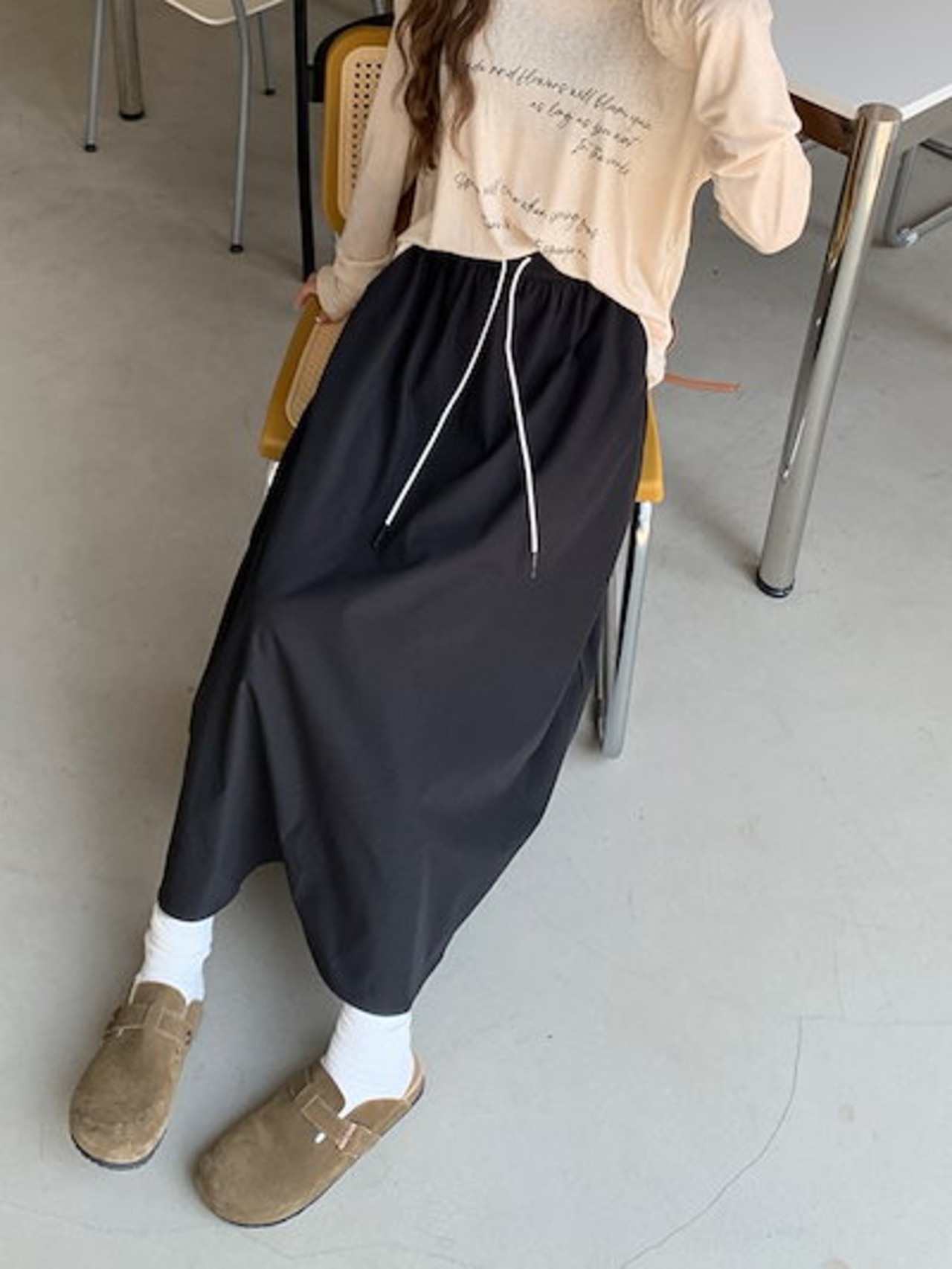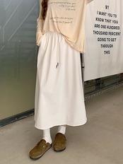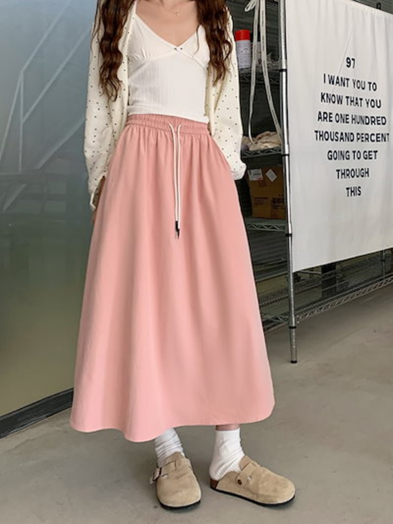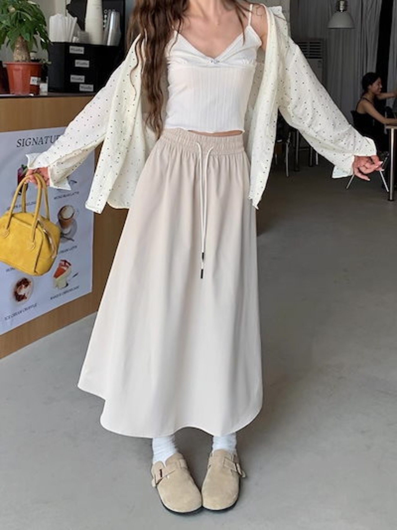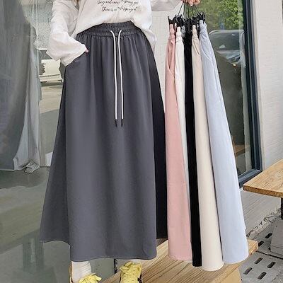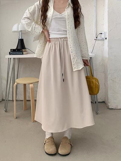 2024 秋冬スカート ミモレ丈 Aライン ウエストゴム ハイウエスト 美脚効果 脚長効果 細見え 秋 白 黒 水色 おしゃれ かわいい 韓国ファッション レディース お出かけ