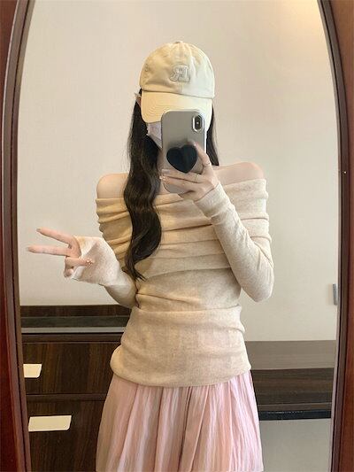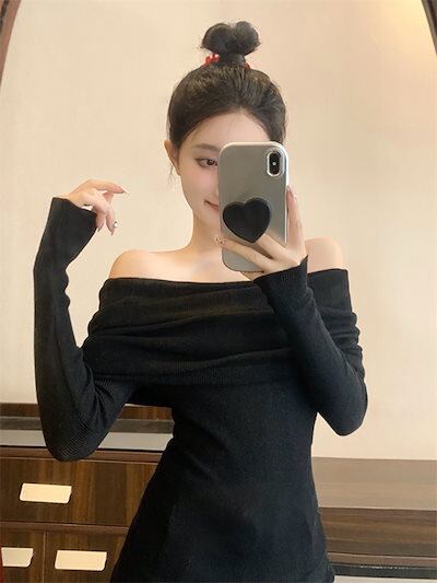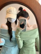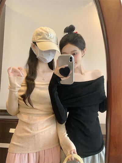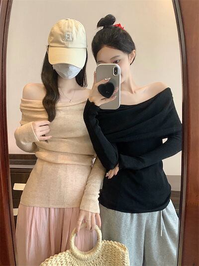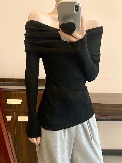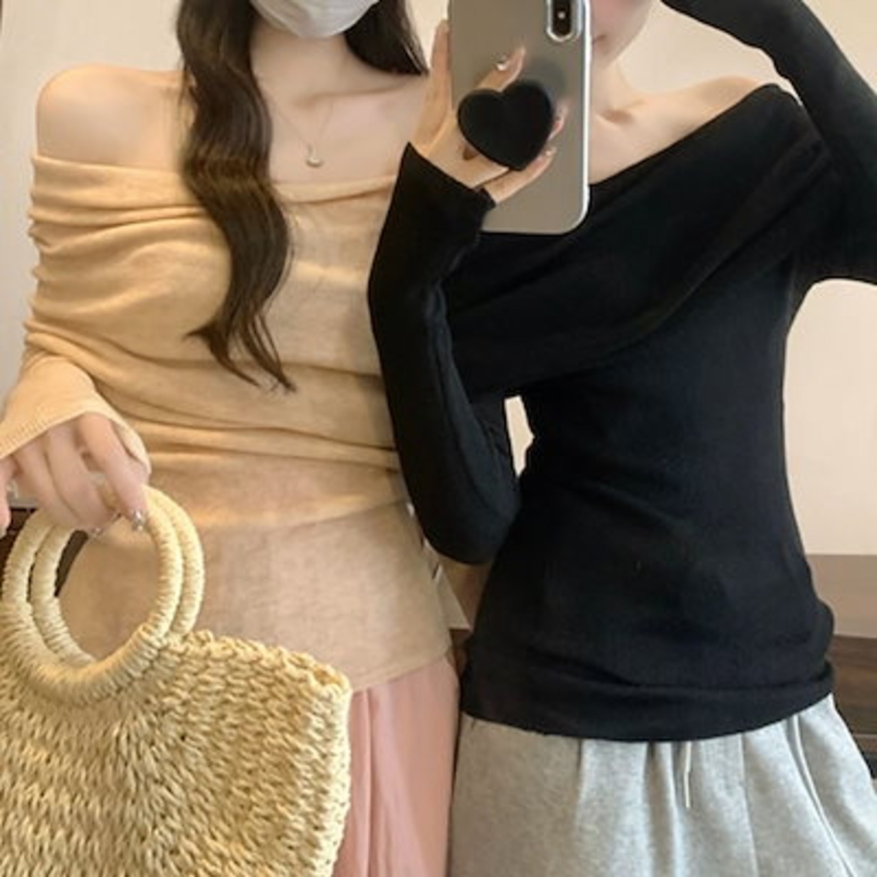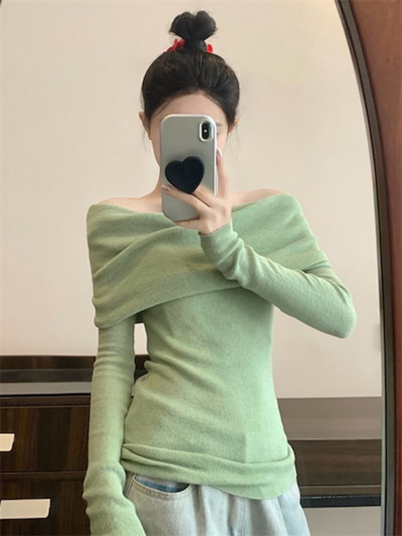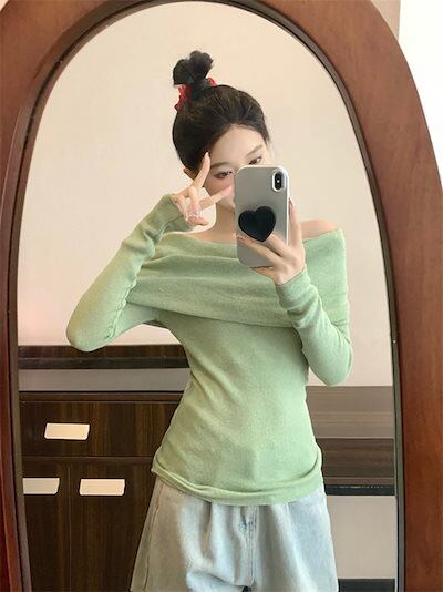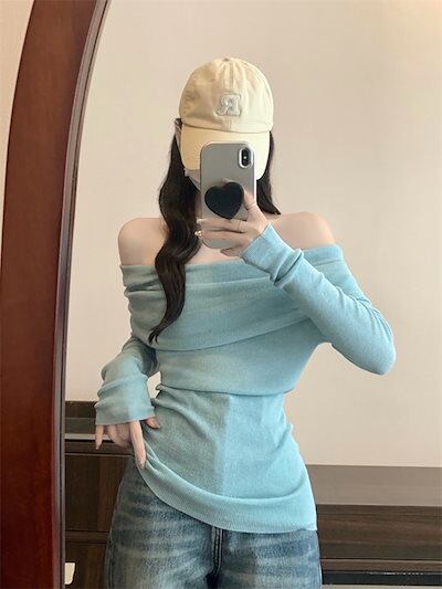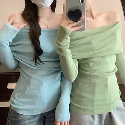 2024秋冬トップス ニット 長袖 オフショルダー 肩見せ スリム 細見え 夏 水色 緑 黒 おしゃれ かわいい 韓国ファッション レディース お出かけ