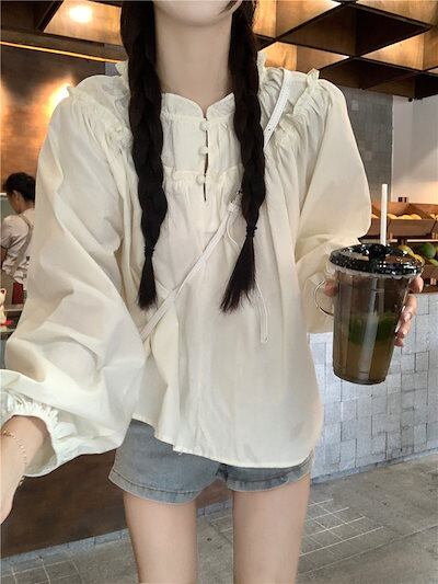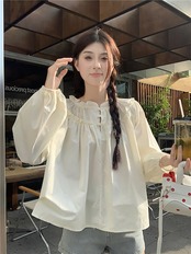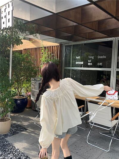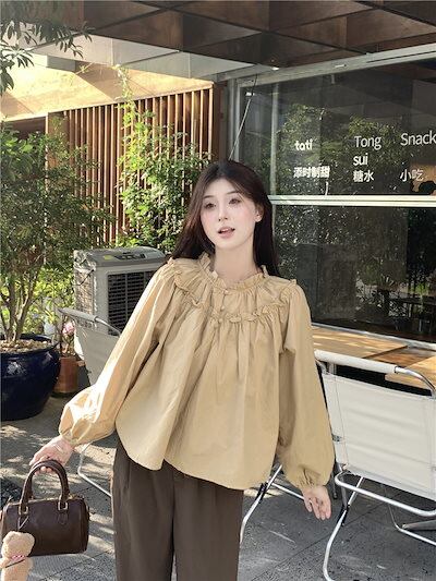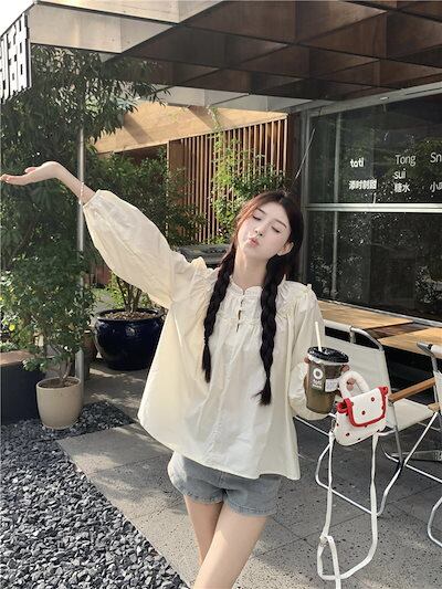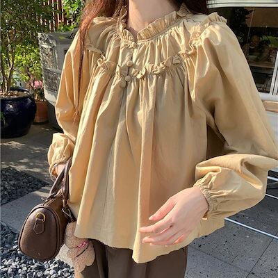 2024秋冬トップス シャツ 長袖 メロウネック ガーリー 甘め キュート 秋 白 茶色 おしゃれ かわいい きれいめ 大人っぽい 韓国ファッション レディース お出かけ