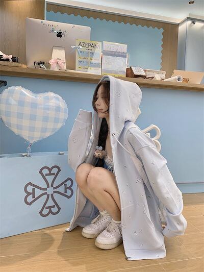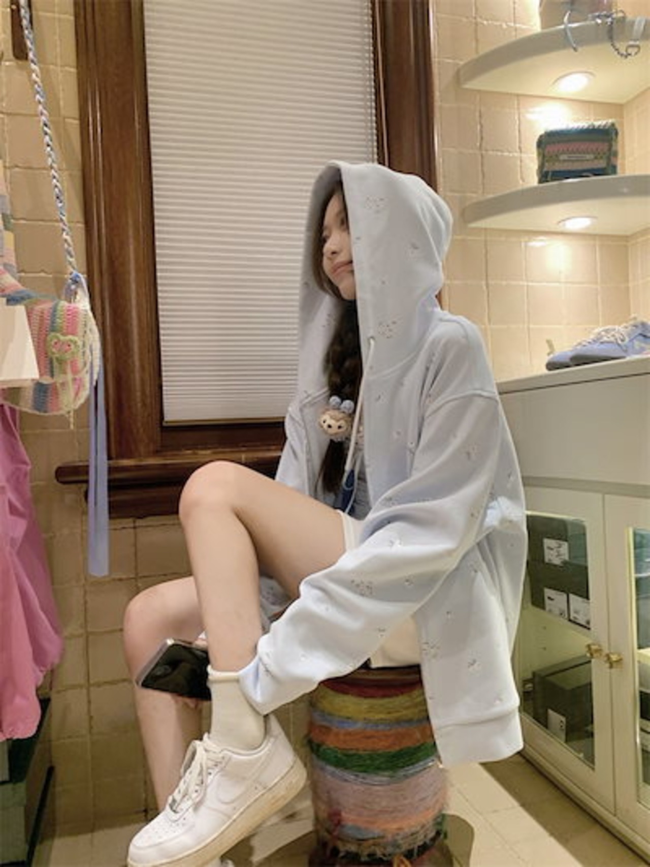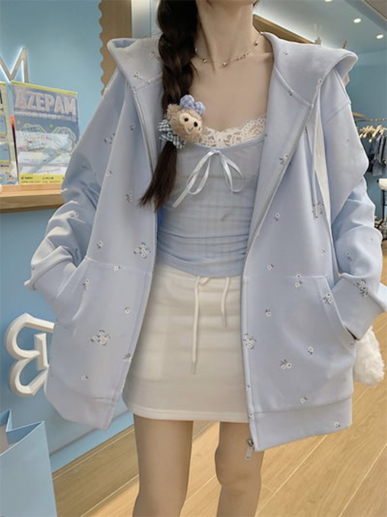 2024 秋冬トップス パーカー フード付き ジップ チャック 長袖 花柄 ポケット 大きめサイズ ゆったり 細見え 秋 水色 おしゃれ かわいい ガーリー キュート 甘め 韓国ファッション レディー