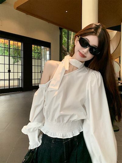 2024秋冬トップス シャツ 長袖 ワンショルダー 肩見せ リボン 秋 白 ホワイト おしゃれ かわいい きれいめ 大人っぽい 韓国ファッション レディース お出かけ