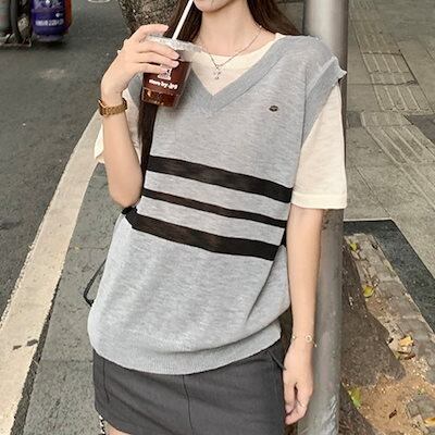 2024秋冬トップス ベスト ニット Vネック ボーダー 半袖 グレー 秋 ゆったり 韓国ファッション レディース おしゃれ かわいい カジュアル お出かけ