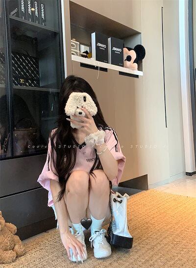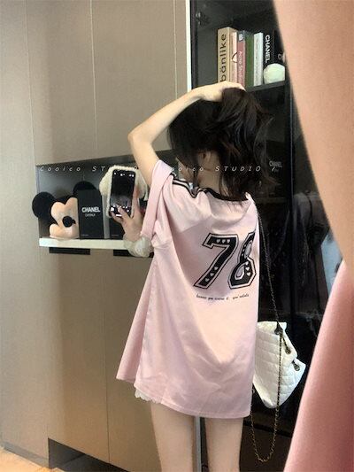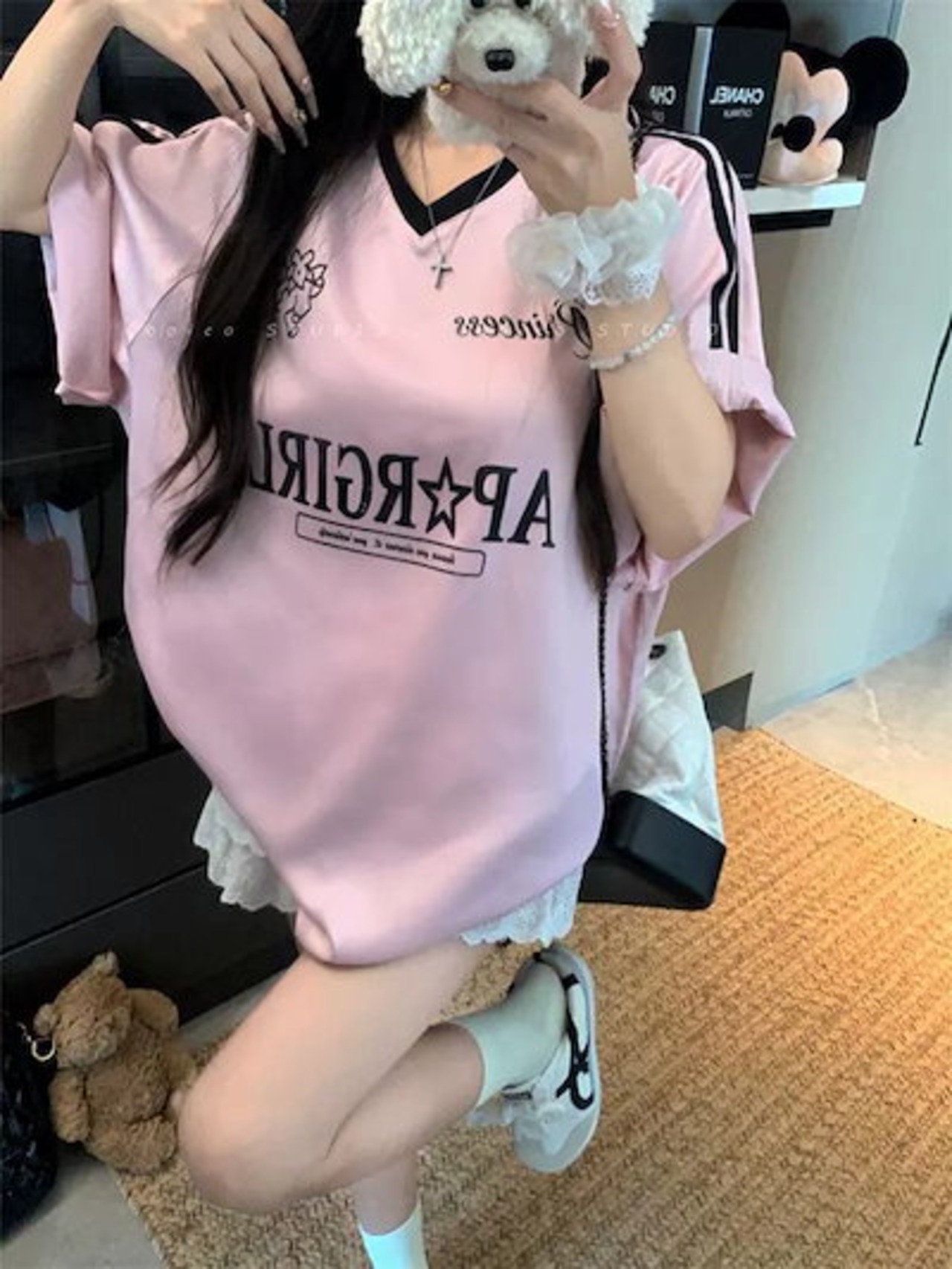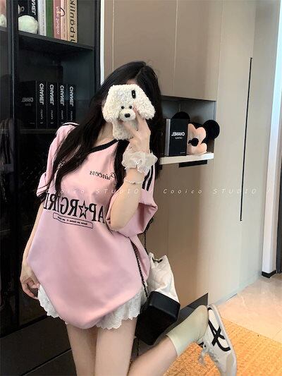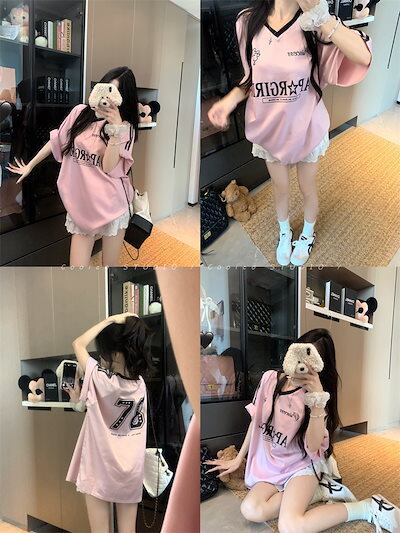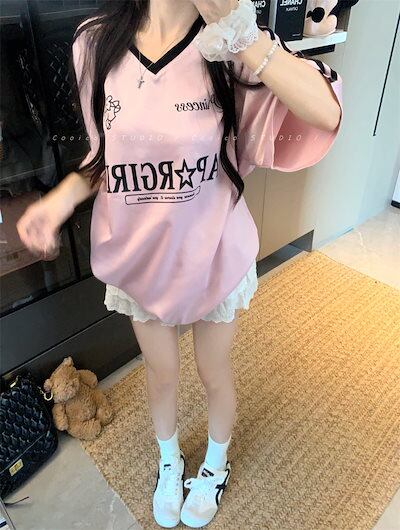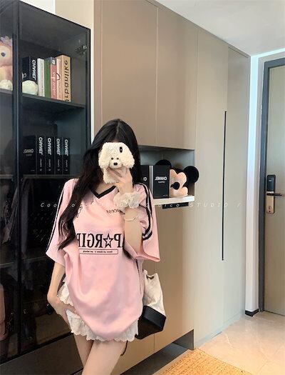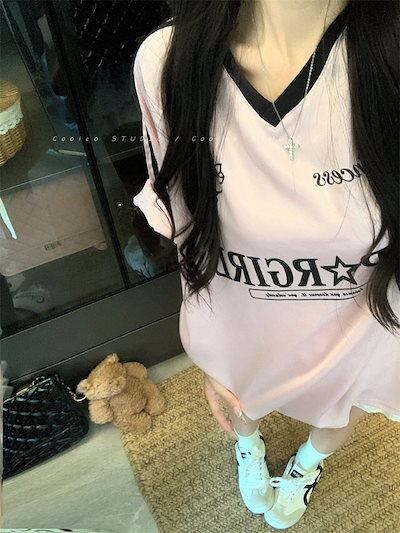 2024夏 韓国可愛い風トップス Tシャツ ファッション 半袖 スリムフィット サイド ペイントシルエットゆったり丈 休日レディースサイズ韓国Vネック おしゃれ カジュアル メンズライク T