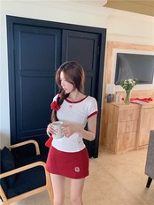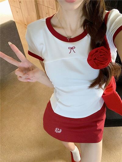 2024 春夏 甘い トップス Tシャツ ラウンドネック丈 休日 フレンチ プリント 韓国 ファッション系 タイト スリムフィット丈短め半袖ミックスレディースサイドへそ出しバイ休日おしゃれT