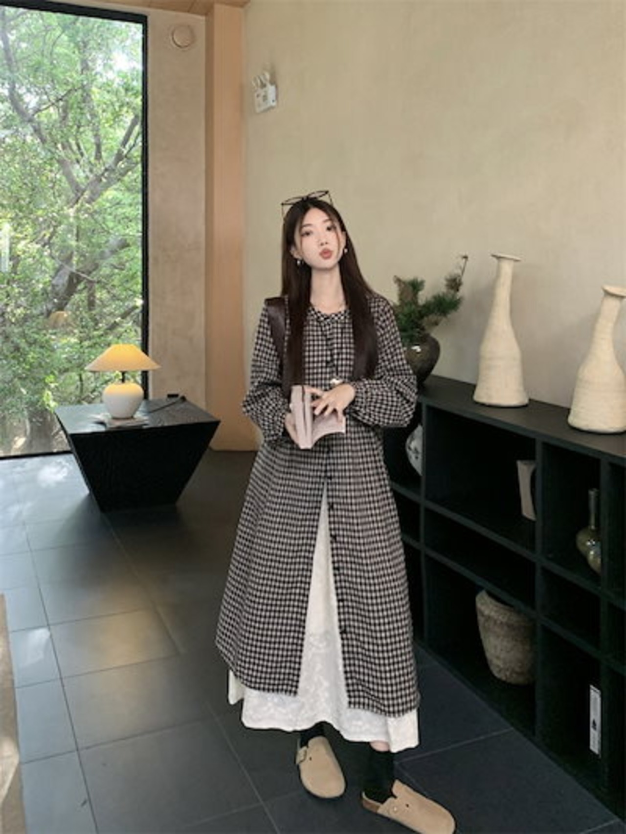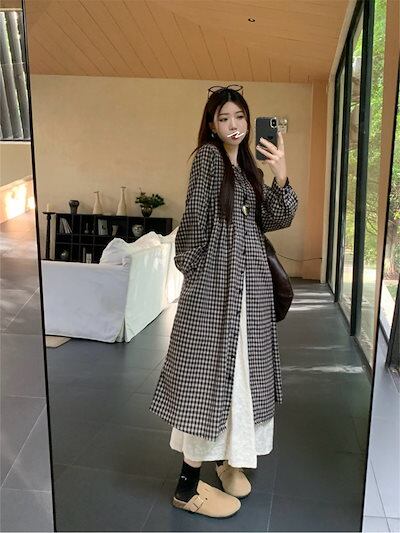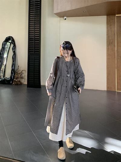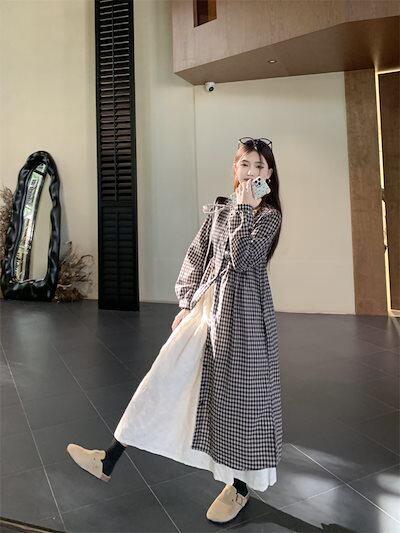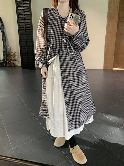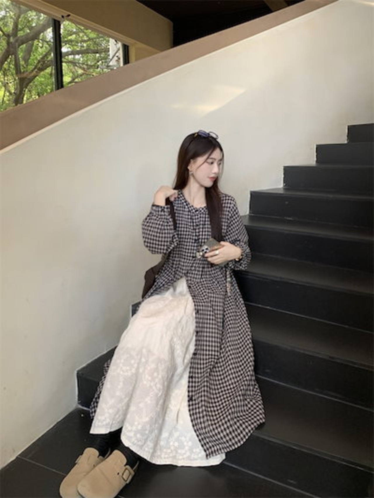 2024春夏ワンピース シャツ ロング丈 ボタン ラウンドネック ギンガムチェック 美脚効果 脚長効果 細見え 秋 黒 ブラック おしゃれ かわいい 韓国ファッション レディース お出かけ
