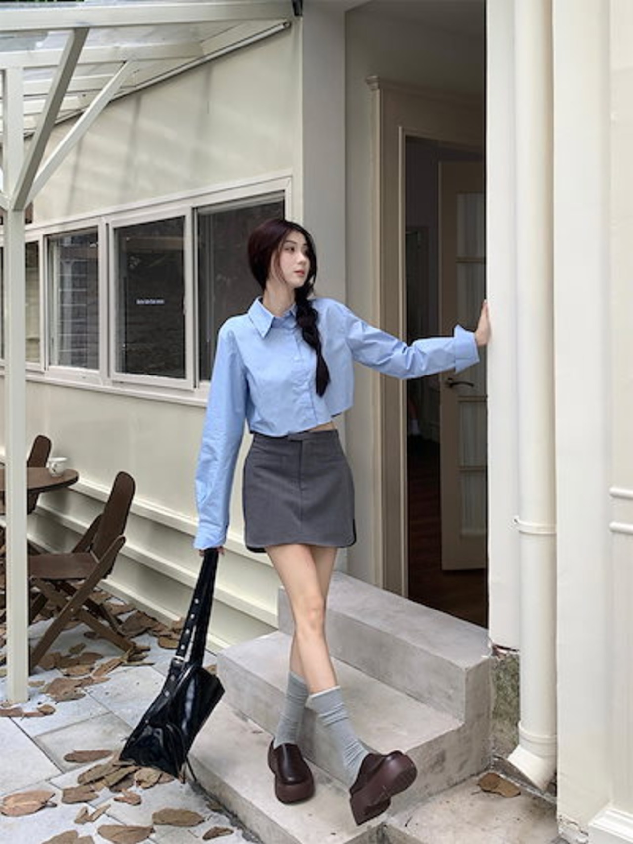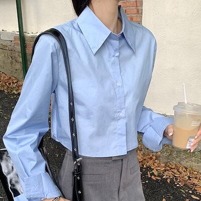 2024夏トップス シャツ 長袖 ボタン 襟 スタンダードカラー 丈短め 細見え 夏 ブルー 青 おしゃれ かわいい 韓国ファッション レディース お出かけ