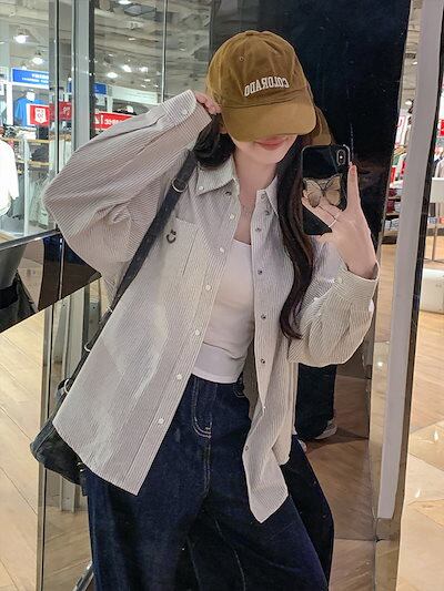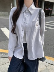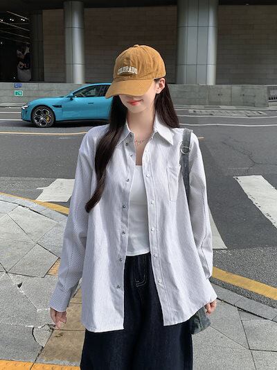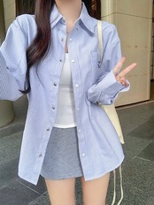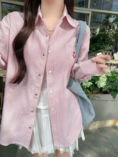 2024夏トップス シャツ 長袖 ボタン 襟 スタンダードカラー ストライプ 刺繍 丈長め ゆったり 細見え 夏 水色 おしゃれ かわいい 韓国ファッション レディース お出かけ