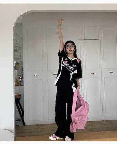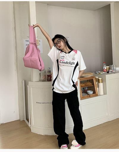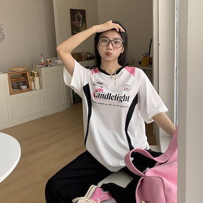 2024夏 韓国可愛い風トップス Tシャツ ファッション 半袖 スリムフィット サイド ペイントシルエット ゆったり丈 休日レディースサイズ韓国Vネック おしゃれ カジュアル メンズライク T