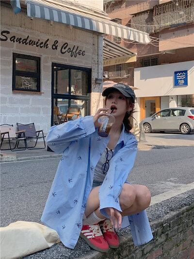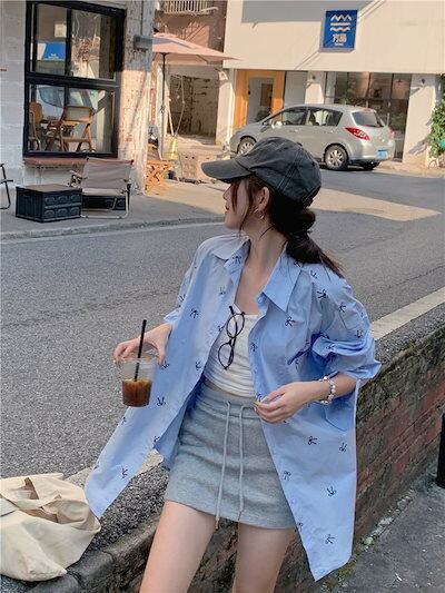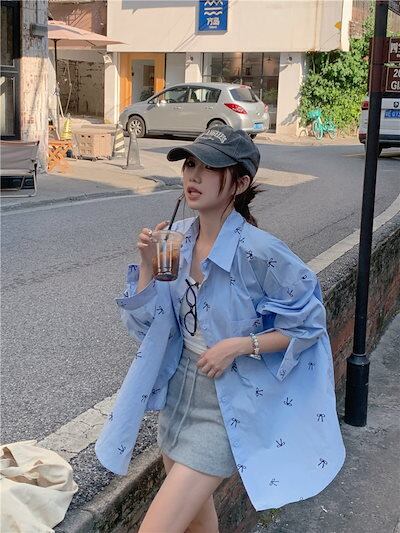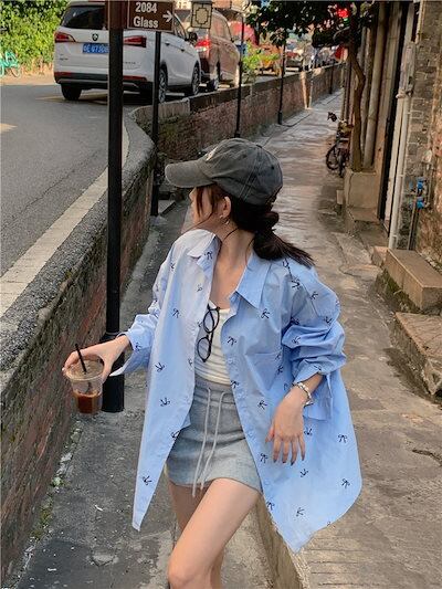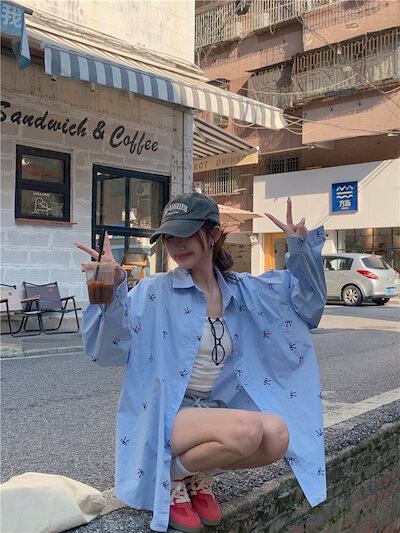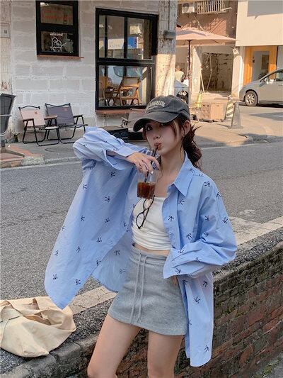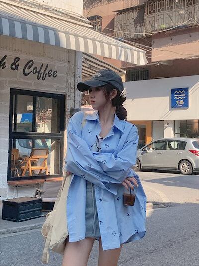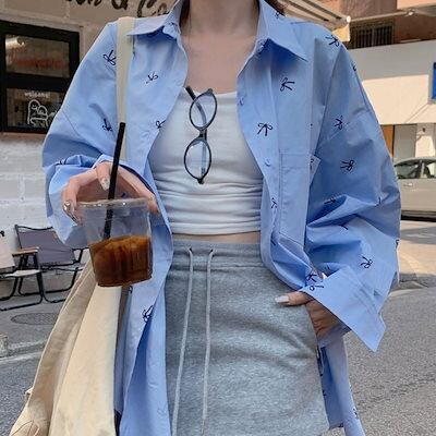 2024夏トップス シャツ 長袖 ボタン 襟 スタンダードカラー リボン 大きめサイズ 丈長め ゆったり 細見え 夏 水色 ライトブルー おしゃれ かわいい 韓国ファッション レディース お出かけ