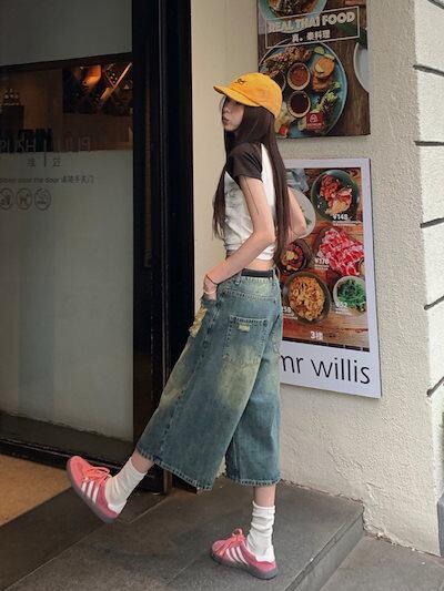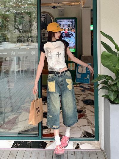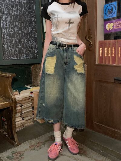 2024春夏パンツ デニム ジーンズ 7分丈 ダメージ加工 ウォッシュ加工 ワイド ハイウエスト 美脚効果 脚長効果 細見え 夏 おしゃれ かわいい 韓国ファッション レディース お出かけ