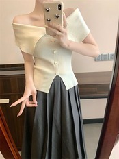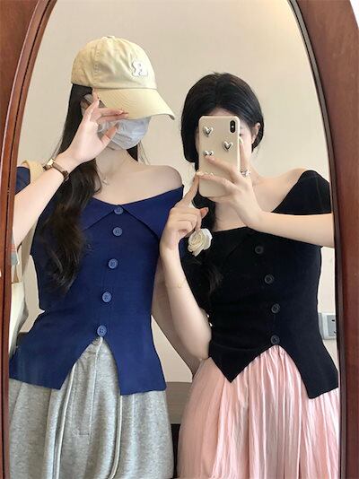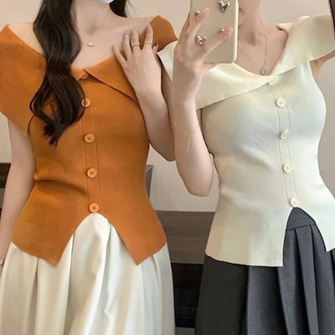 2024夏トップス シャツ 半袖 オフショルダー ボタン スリム 細見え 夏 白 オレンジ 黒 おしゃれ かわいい 韓国ファッション レディース お出かけ