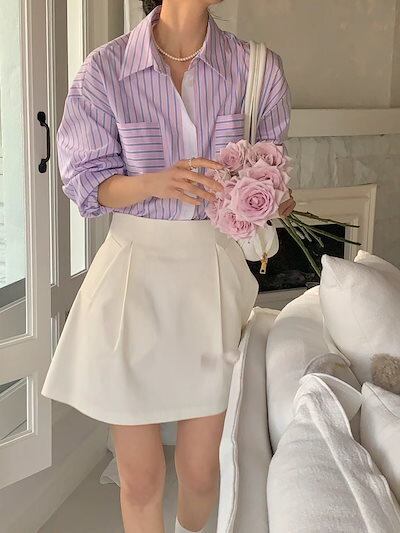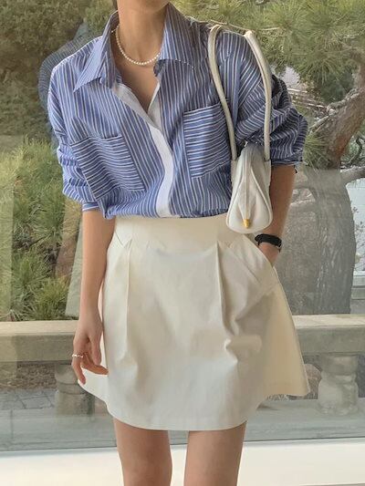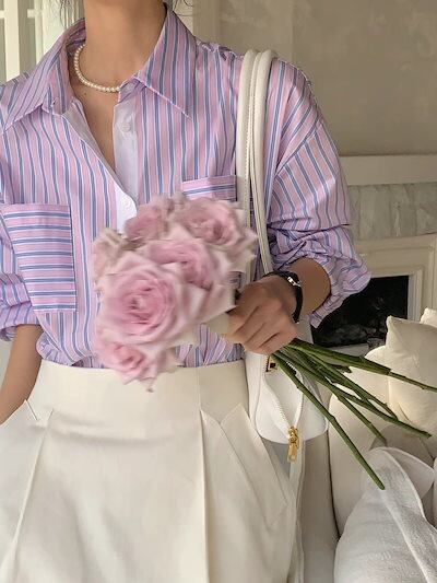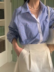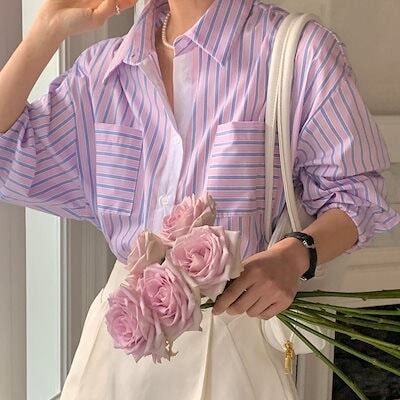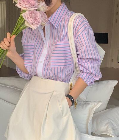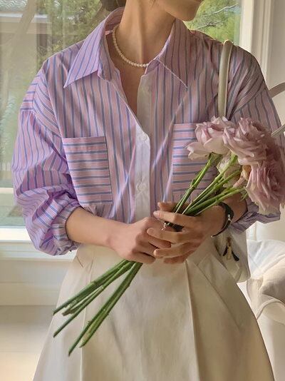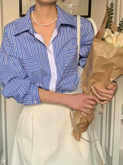 2024夏トップス シャツ 長袖 ボタン 襟 スタンダードカラー ストライプ ボーダー ゆったり 細見え 夏 青 おしゃれ かわいい 韓国ファッション レディース お出かけ