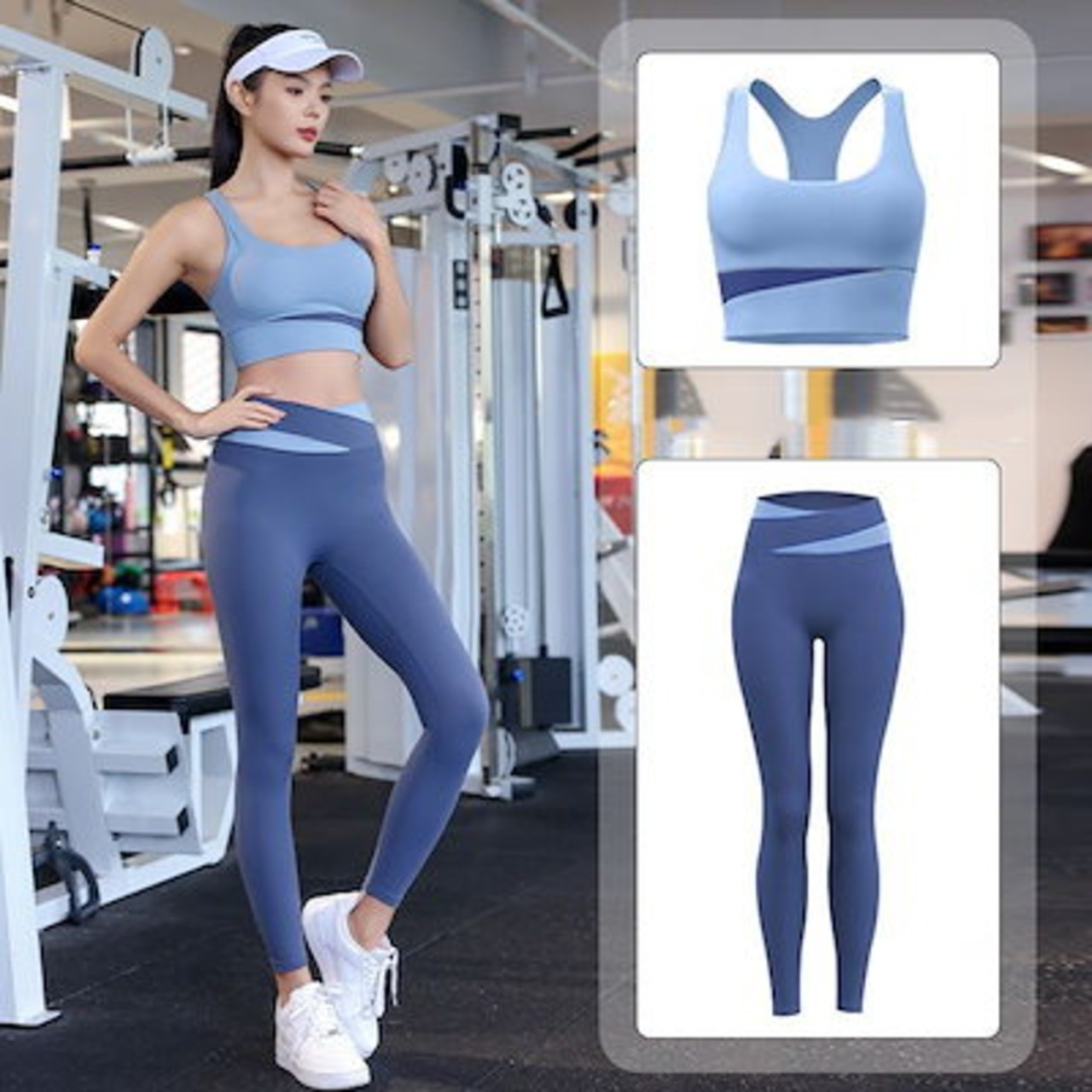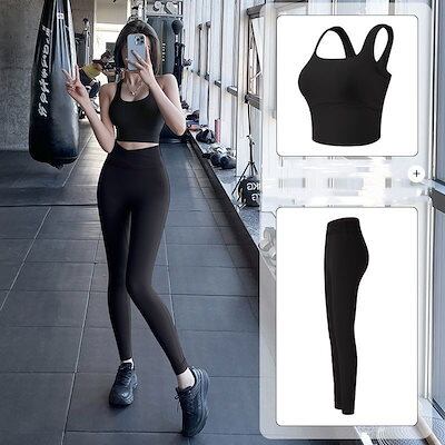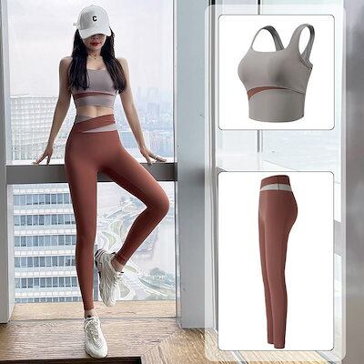 レディー切り替えヨガウェア上下セット 胸当て付きスポーツ下着+ヨガパンツ2点セット