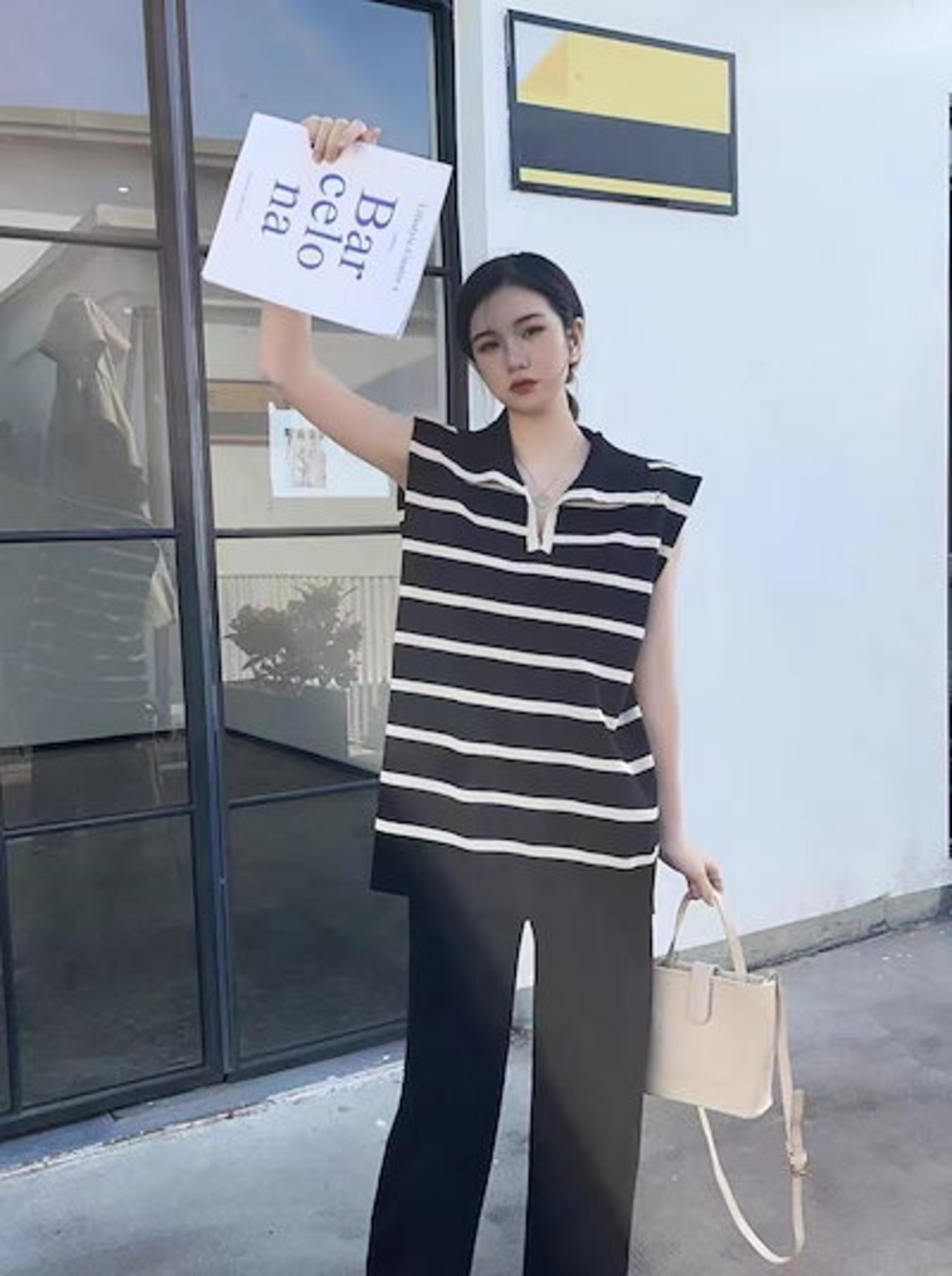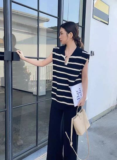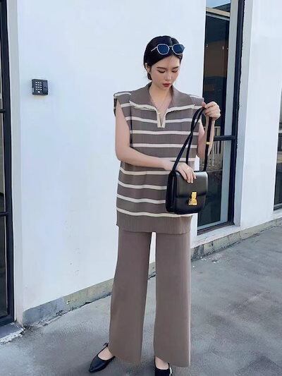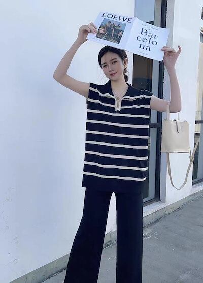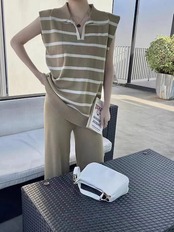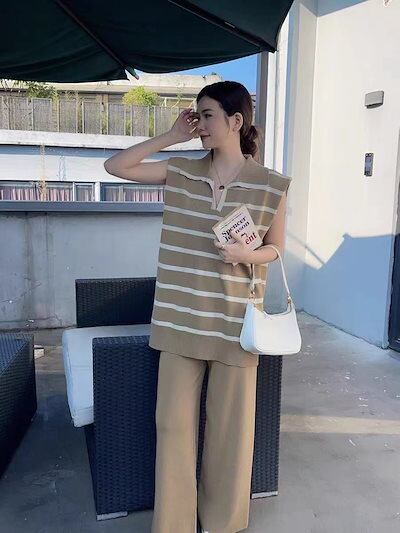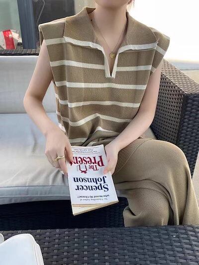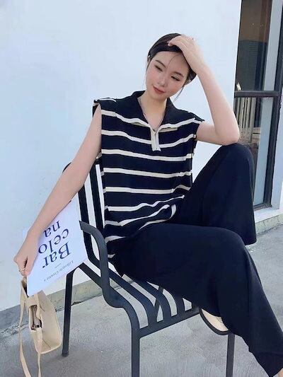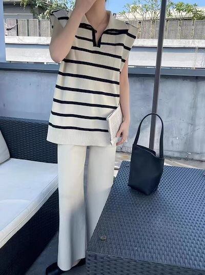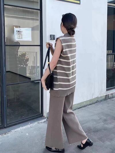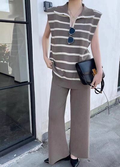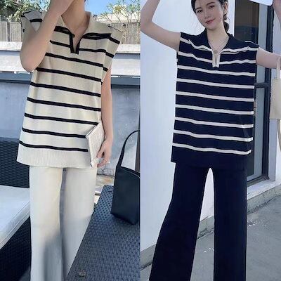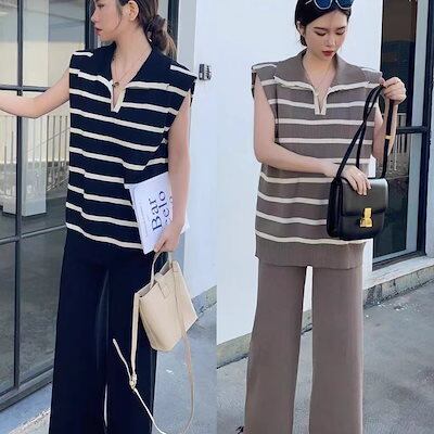 春夏 ノースリーブセット ストライプ 薄手ニット+ハイウエストワイドパンツ 上下セット レディース春セットアップ レディースニットベスト ジャージ スウェット 卒業式 ママ フォーマル メガ割