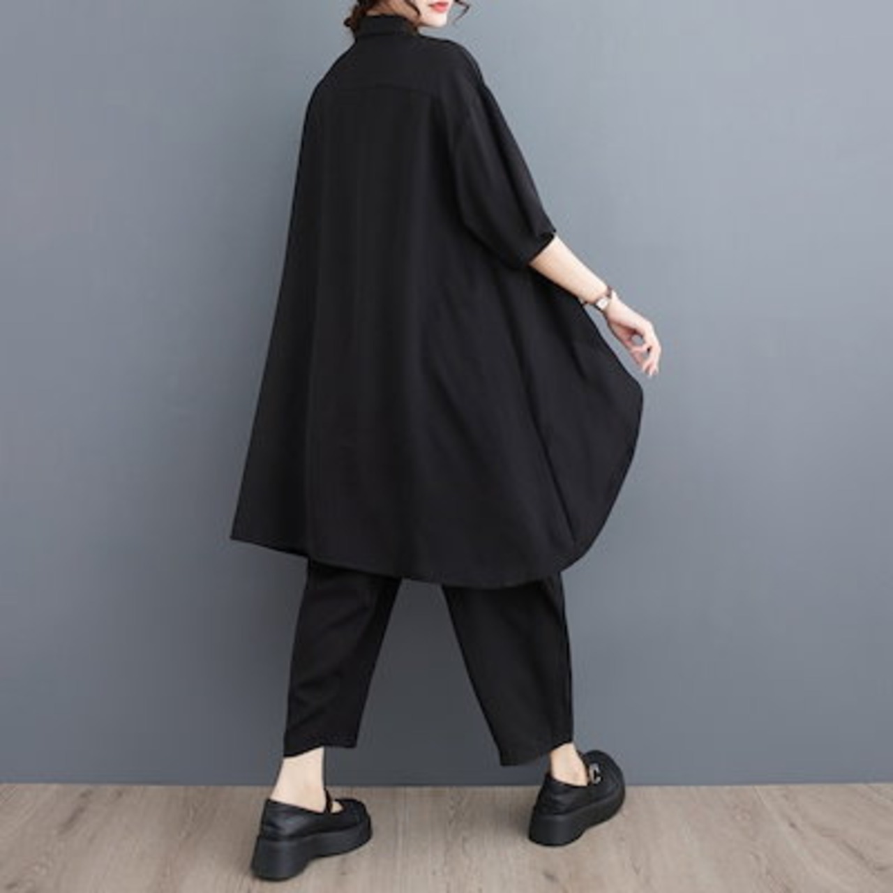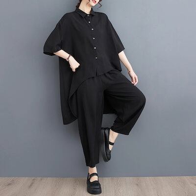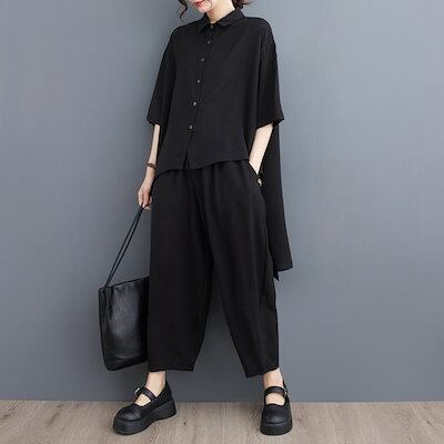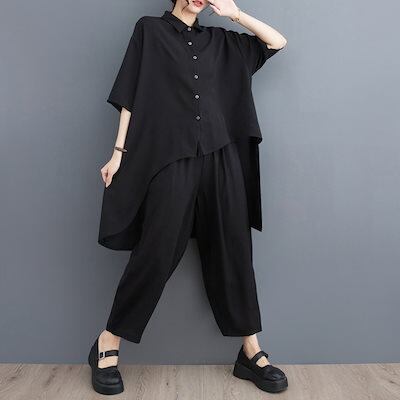 【お勧め商品】「ファットガール」ブラウス+7分丈パンツ 夏 上下セット お尻すぽっり 体型カバー 着痩せ ゆったり 大きいサイズ セットアップ ママスーツ ジャージ 卒業式 人気 メガ割