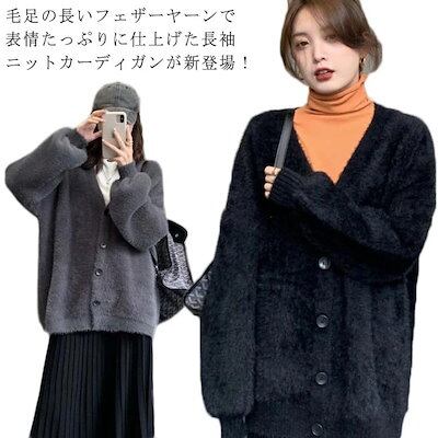 レディース ライトアウター レディース ニットカーディガン ロング Vネック ボリューム袖 秋冬 トップス ゆったり ニット 羽織り コーディガン 長袖 無地 大きいサイズ 厚手 ゆったり