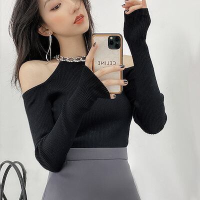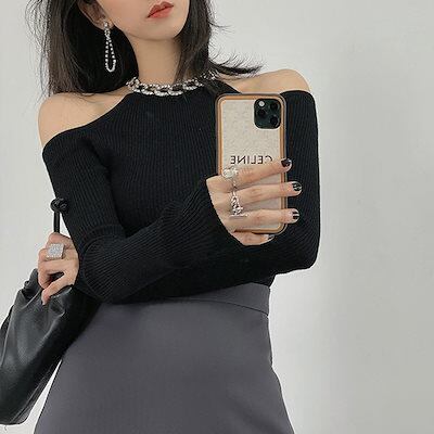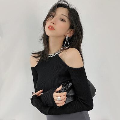 フラッシュダイヤモンド鎖肩露出セクシーセーターレディース秋冬ケアマシンスリムインナートップス